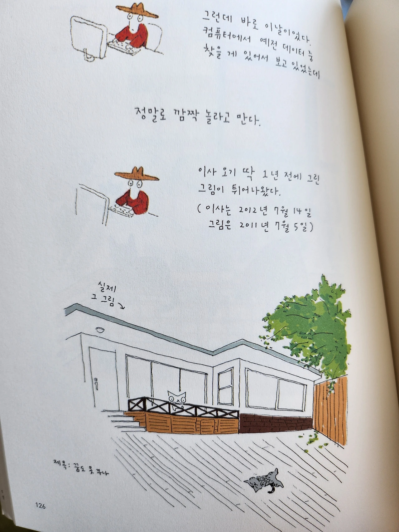 어쩌면 우연의 다른 말은 필연인지도 모른다. 그런데 바로 이날이었다. 컴퓨터에서 예전 데이터 중 찾을 게 있어서 보고 있었는데 정말로 깜짝 놀라고 만다. 이사 오기 딱 1년 전에 그린 그림이 튀어나왔다.(그림은 2011.7.5, 이사는 2012.7.14일)