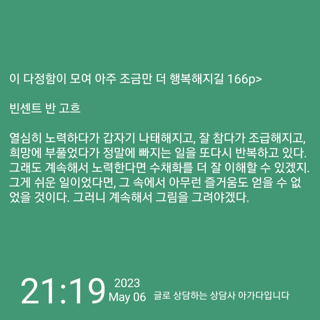 이 다정함이 모여 아주 조금만 더 행복해지길 166p> 빈센트 반 고흐> 열심히 노력하다가 갑자기 나태해지고, 잘 참다가 조급해지고, 희망에 부풀었다가 정말에 빠지는 일을 또다시 반복하고 있다. 그래도 계속해서 노력한다면 수채화를 더 잘 이해할 수 있겠지. 그게 쉬운 일이었다면, 그 속에서 아무런 즐거움도 얻을 수 없었을 것이다. 그러니 계속해서 그림을 그려야겠다.
