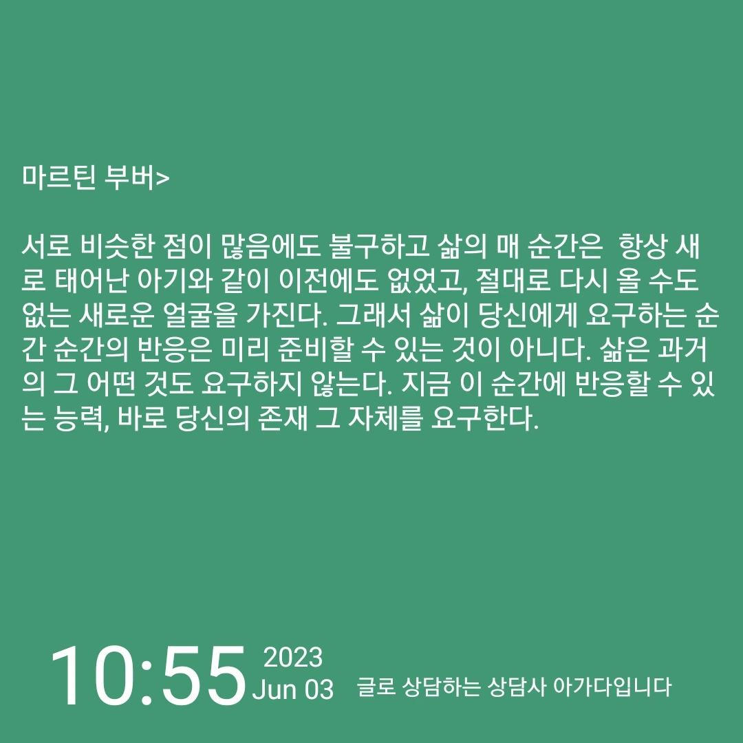 서로 비슷한 점이 많음에도 불구하고 삶의 매 순간은 항상 새로 태어난 아기와 같이 이전에도 없었고, 절대로 다시 올 수도 없는 새로운 얼굴을 가진다. 그래서 삶이 당신에게 요구하는 순간순간의 반응은 미리 준비할 수 있는 것이 아니다. 삶은 과거의 그 어떤 것도 요구하지 않는다. 지금 이 순간에 반응할 수 있는 능력, 바로 당신의 존재 그 자체를 요구한다.
