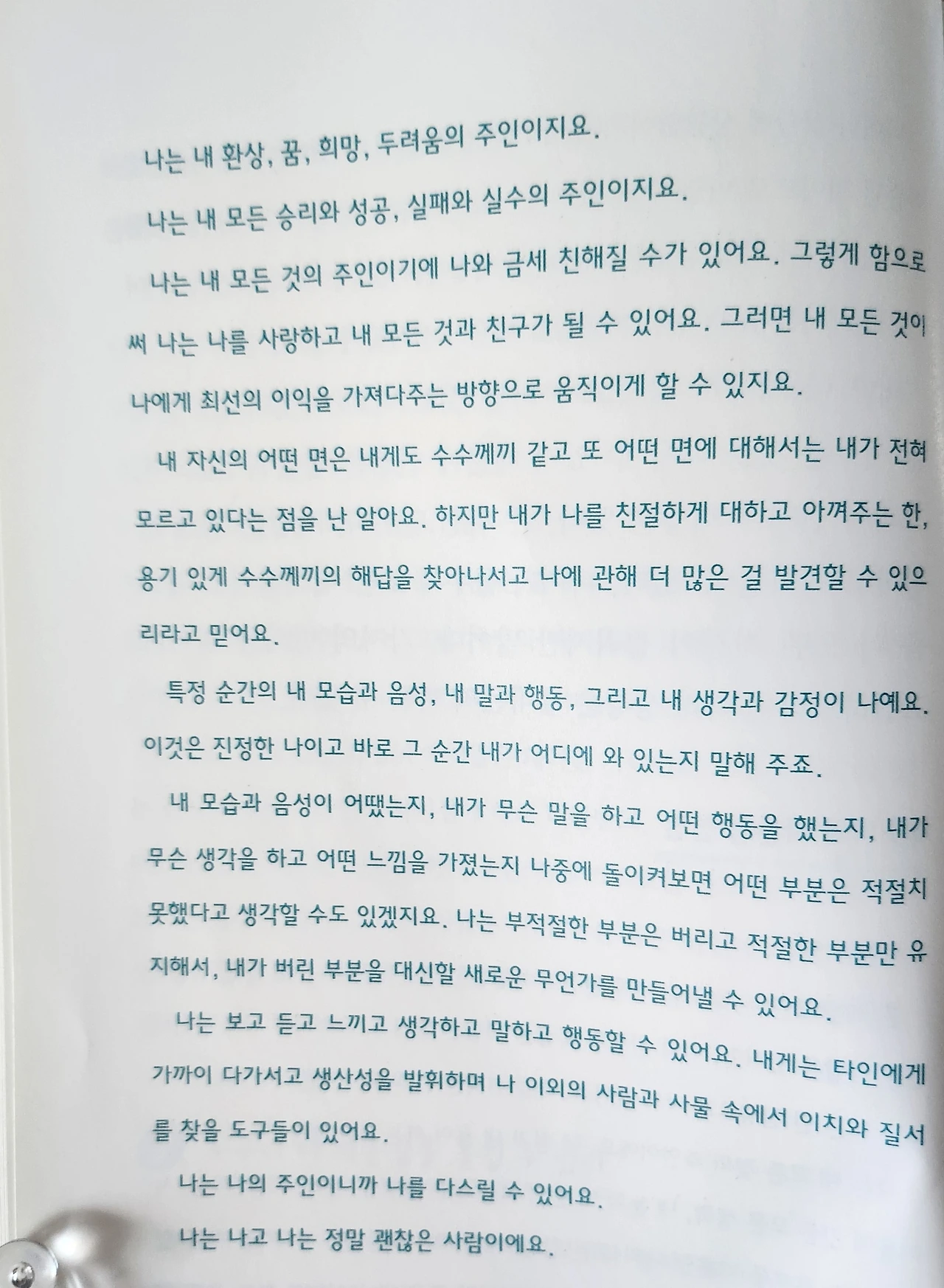 나는 나예요. 온 세상에 어느 누구도 나와 완전히 똑같은 사람은 없어요. 어떤 부분이 나와 같은 사람은 있지만 나와 완전히 똑같은 사람은 없지요. 그러니까 나에게서 나오는 모든 건 진정으로 나의 것이죠. 그걸 선택한 건 오로지 나뿐이니까요. 나는 내 모든 것의 주인이에요.