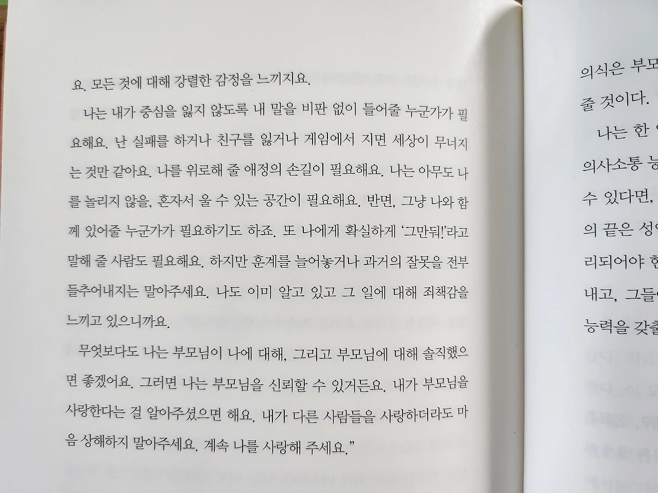 특히, 기억에 남는 연습활동은 한 손을 높이 올리고 있는 체험활동이었다. 어린아이들이 부모와 손을 잡고 걸을 때 체격차이로 아이의 손은 높이 올라간다. 부끄럽지만, 나는 아이들이 불편해할 것이란 생각을 하지 못했다. 조금만 손을 들고 있어도 뻐근하고 아픈데.. 그래서 아이들이 어릴 때 그렇게 손을 안 잡으려고 했을까? ㅎㅎㅎ 현재 이 책은 절판된 상태라서 도서관 대여로 읽었다. 나중에 상담사로서 가족상담을 공부하게 된다면 책에 수록된 많은 연습활동들이 도움이 될 것 같다. 마지막으로 청소년아이가 집에 있어서 그런지.. 청소년아이의 마음을 읽어주듯 10대 아이들의 관점을 글로 표현한 것도 인상적이었다.