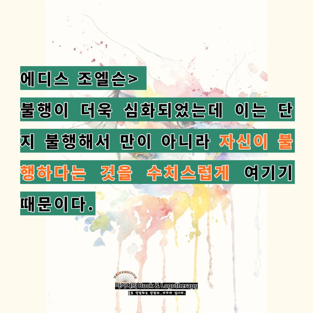 에디스 조엘슨> 불행이 더욱 심화되었는데 이는 단지 불행해서 만이 아니라 자신이 불행하다는 것을 수치스럽게 여기기 때문이다.