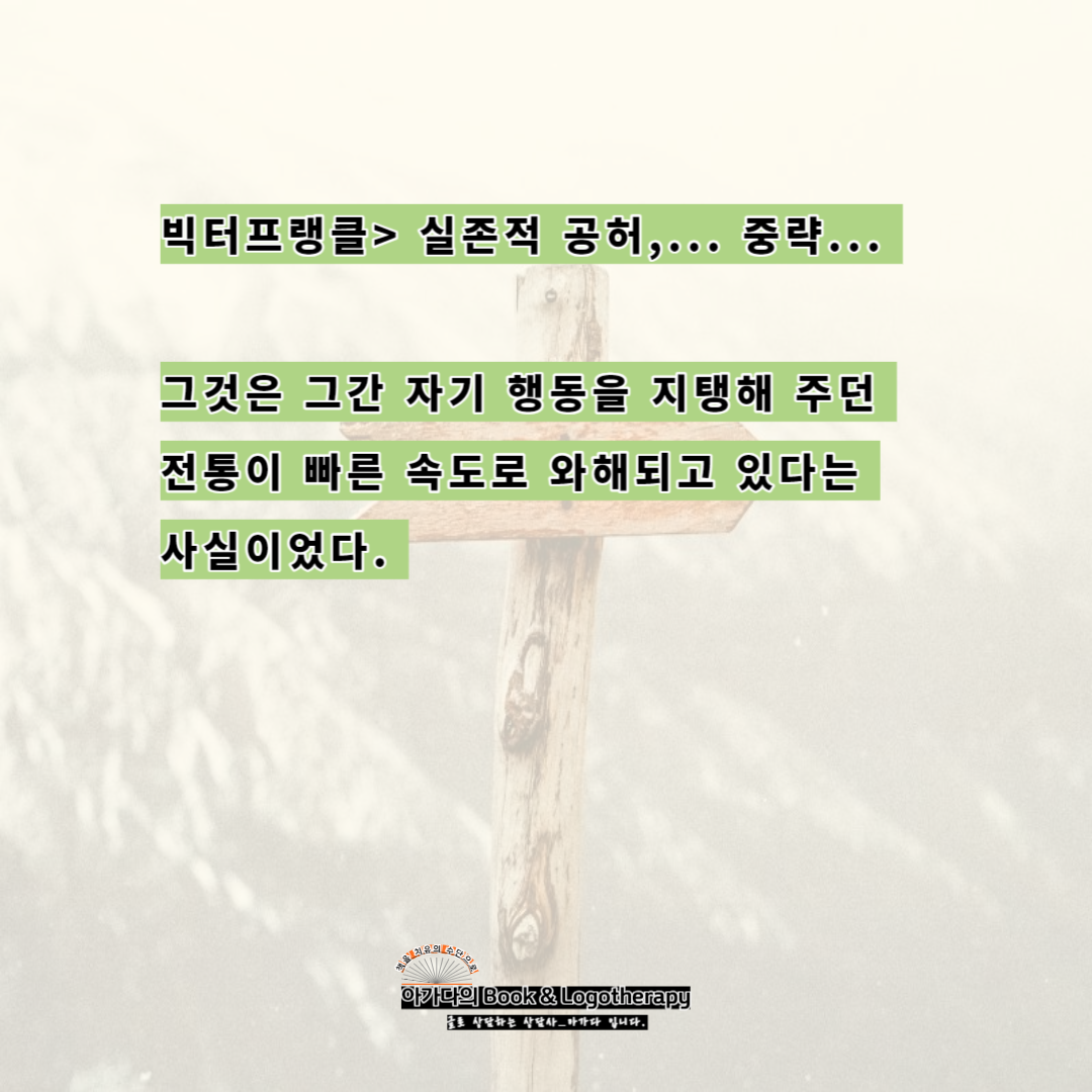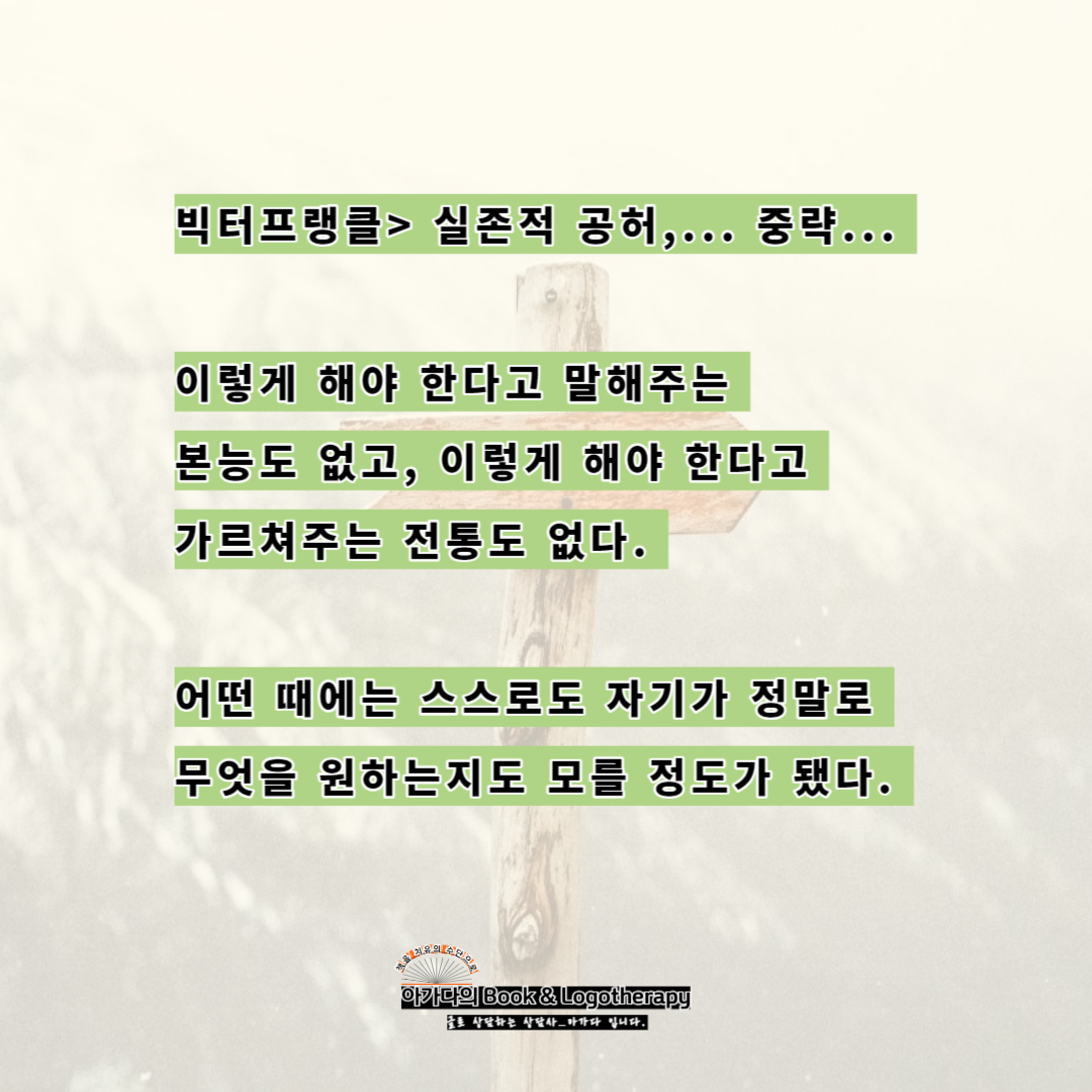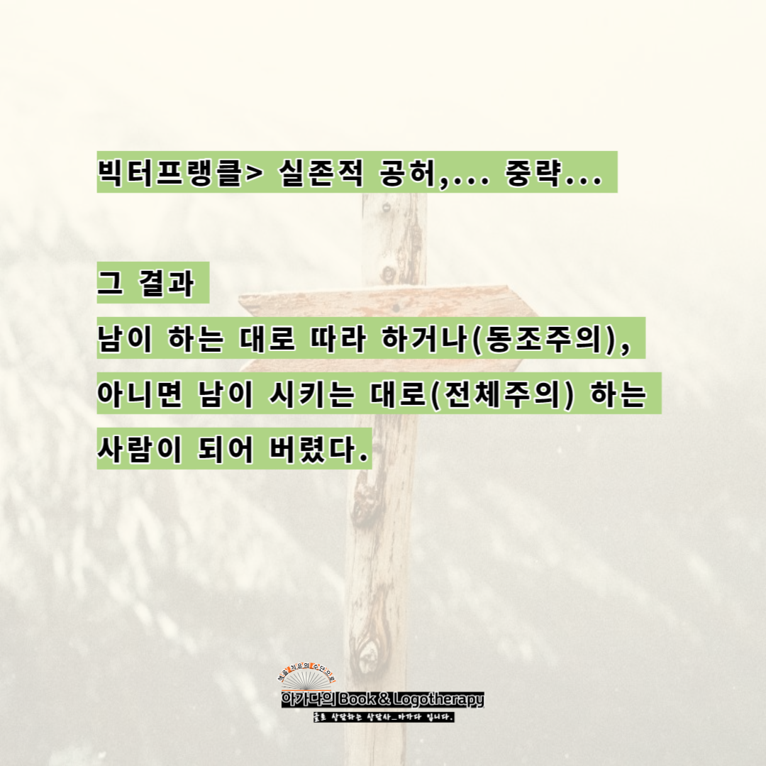 실존적 공허,... 중략... 그것은 그간 자기 행동을 지탱해 주던 전통이 빠른 속도로 와해되고 있다는 사실이었다. 이렇게 해야 한다고 말해주는 본능도 없고, 이렇게 해야 한다고 가르쳐주는 전통도 없다. 어떤 때에는 스스로도 자기가 정말로 무엇을 원하는지도 모를 정도가 됐다. 그 결과 남이 하는 대로 따라 하거나(동조주의), 아니면 남이 시키는 대로(전체주의) 하는 사람이 되어 버렸다.