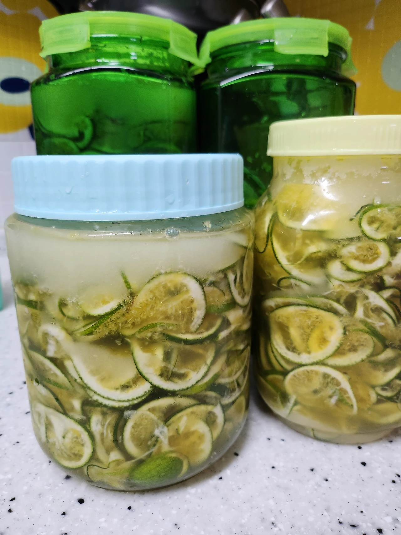 주말에 만난 대학동창언니가 요즘 청귤철이라고 가족들이 음료수를 좋아하면 청귤청을 담아보라고 했습니다. 그 말을 들은 즉시 저는 청귤을 5킬로 주문했습니다. 매년 자몽, 청귤, 레몬, 도라지로 청을 담아서 식구들과 맛나게 먹기에 망설임 없이 주문했죠. 3킬로나 5킬로나 배송료가 똑같아서 이왕이면 다홍치마라고 5킬로를 주문했습니다. 배송받은 순간, <허걱> 5킬로 많네요. 갑자기 작년 도라지가 생각납니다. 채칼을 꺼내 들었죠. 그리고 열심히 채를 썰었습니다. 양이 참 많네요. 평소 김치 담던 대야에 한가득입니다. ㅎㅎㅎ 집에 있는 유리병도 다 쓰고 말았어요. 이번엔 영혼까지는 아니고 청귤청 채 썰다가 제 팔까지 채 썰뻔했어요. ㅋㅋㅋ 채칼이 없었으면 청귤청 담고 하루는 꼬박 앓아누웠을 것 같아요.