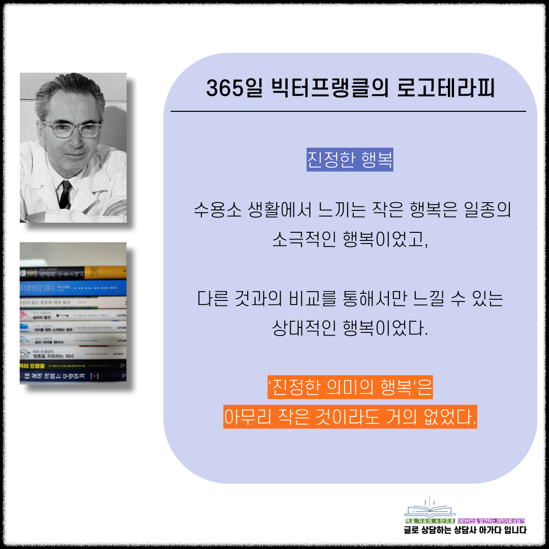 빅터프랭클의 죽음의 수용소에서> 수용소 생활에서 느끼는 작은 행복은 일종의 소극적인 행복이었고, 다른 것과의 비교를 통해서만 느낄 수 있는 상대적인 행복이었다. '진정한 의미의 행복'은 아무리 작은 것이라도 거의 없었다.