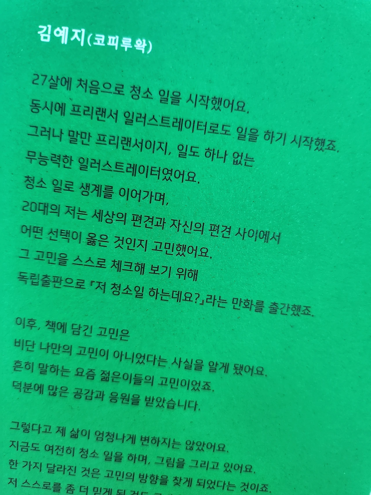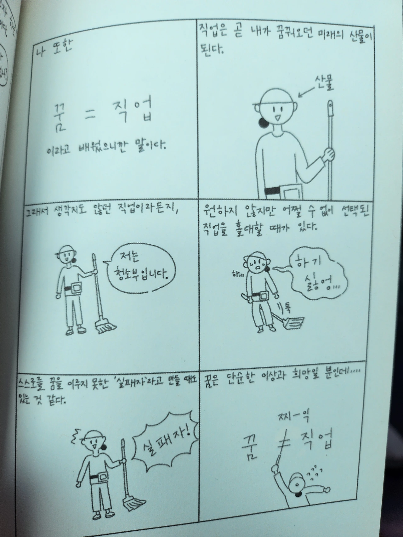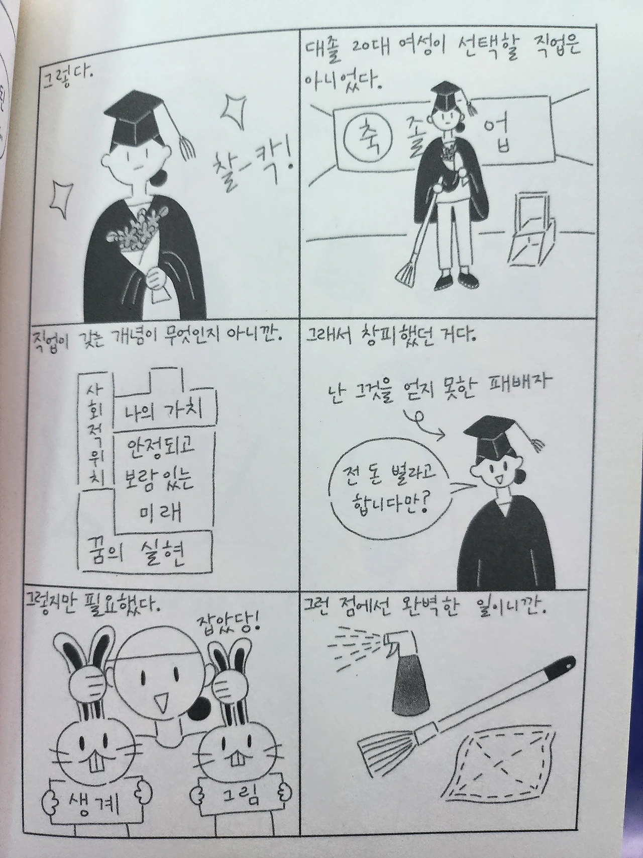 김예지 작가님은 일러스트레이터의 꿈을 이루기 위해 27살의 젊은 나이에 다니던 회사를 그만두고 청소일을 시작했다. 누군가에겐 평범한 질문인 '무슨 일 하세요?'가 작가님에겐 얼마나 당황스럽고 혼란스러운 질문이었을까? 나도 그렇다. 누가 나에게 '무슨 일 하세요?'라고 물으면 '학생'이라고 해야 할지 '심리상담사'라고 해야 할지 '주부'라고 해야 할지 '무직'이라고 해야 할지 갈피를 잡지 못한다.