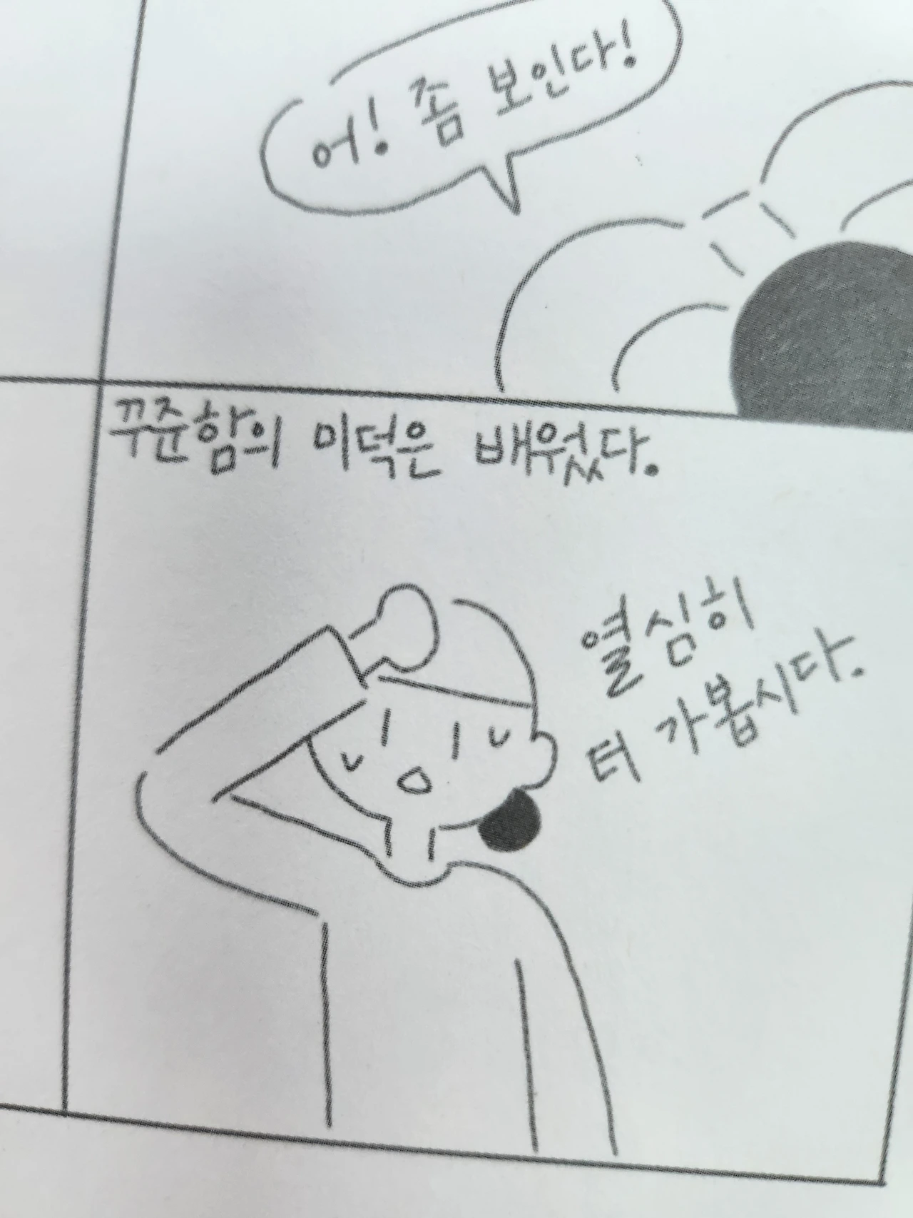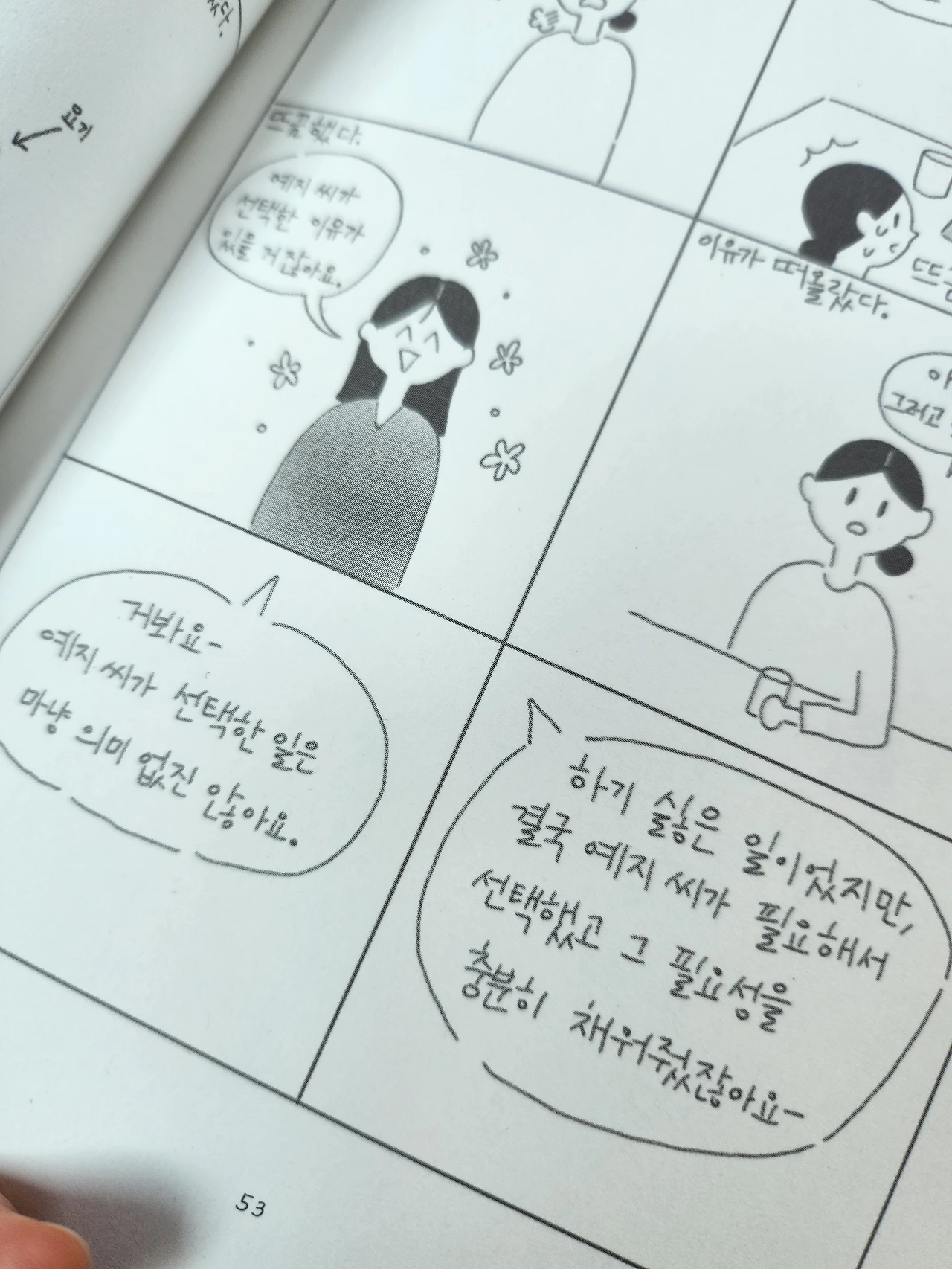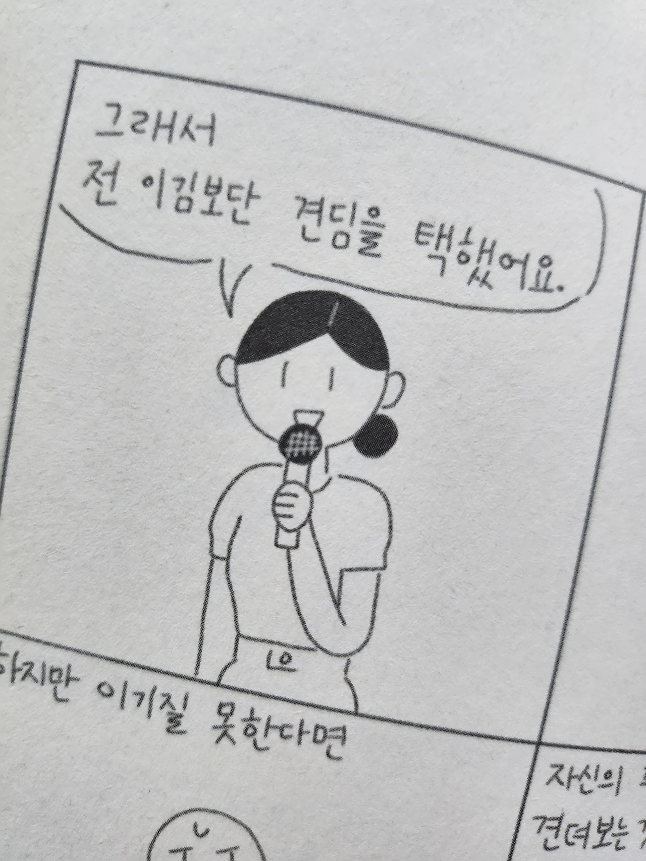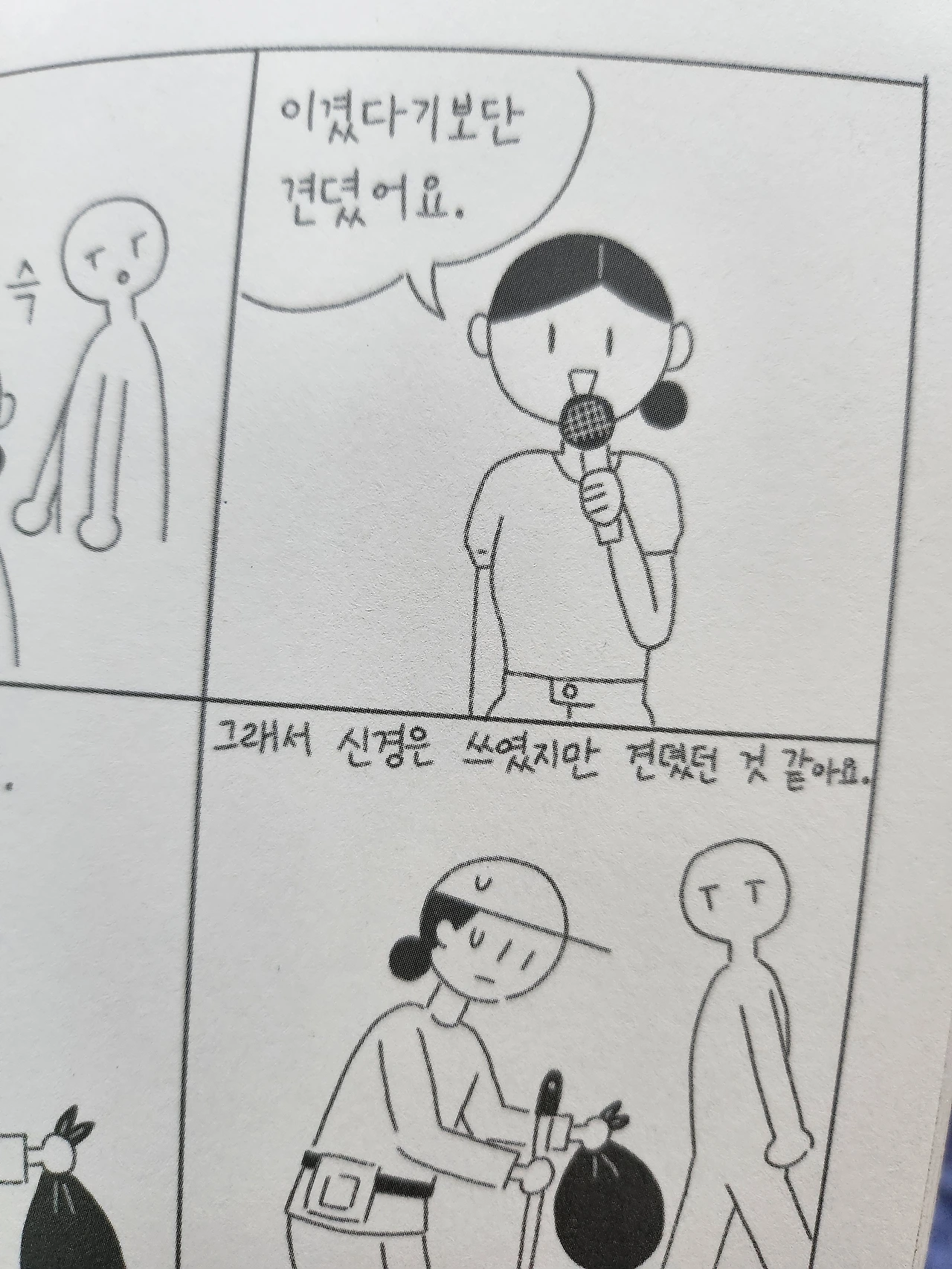 작가님은 힘들 때 심리상담을 받았는데 당시 상담사가 이런 말을 했다고 한다. '하기 싫은 일이었지만 결국 예지 씨가 필요해서 선택했고 그 필요성을 충분히 채워줬잖아요' 자신의 선택을 책임지며 꾸역꾸역 그 힘든 시간을 견딘 그녀. '이김'보다는 '견딤'을 선택한 그녀는 자신을 꿈을 이루었고, 여전히 일러스트이면서 청소부다.