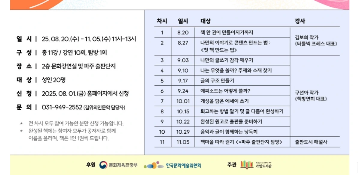 집 근처에 도서관이 많으니 지역주민으로서 받는 혜택이 참 많다. 이번에 집 근처 두 도서관이 문화체육관광부가 주최하고 한국문화예술위원회가 주관하는 ‘2025 길 위의 인문학’ 및 '지혜학교' 사업 선정되었다는 소식을 들었다.
