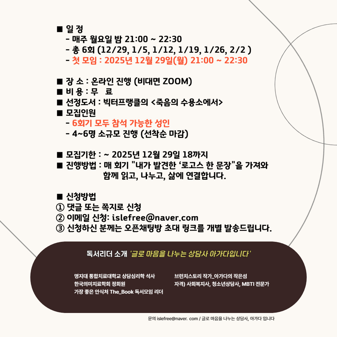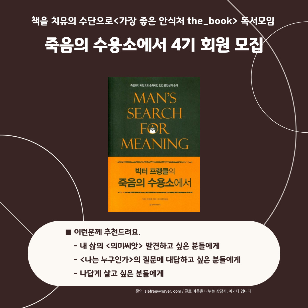 #독서모임 #온라인독서모임 #의미있는독서 #로고테라피 #삶의의미 #나를만나는독서 #중년독서 #중년의질문 #중년기전환 #나는누구인가 #나답게살기 #의미씨앗 #문장수집 #책으로대화하기 #죽음의수용소에서 #빅터프랭클 #마음돌봄 #심리독서 #가장좋은안식처THE_BOOK #글로마음을나누는상담사아가다입니다