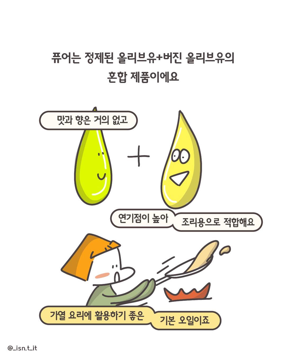 퓨어는 정제된 올리브유+버진 올리브유의 혼합 제품이에요