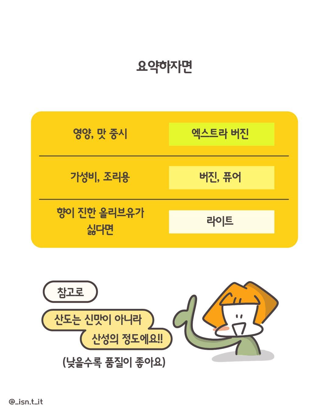 요약하자면 영양·맛 중시 → 엑스트라 버진조리용·가성비 → 퓨어, 라이트향이 진한 올리브유가 싫다면 → 라이트