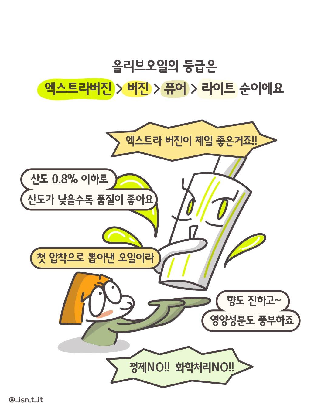 올리브오일은 엑스트라 버진>버진>퓨어>라이트 순으로 등급이 낮아져요