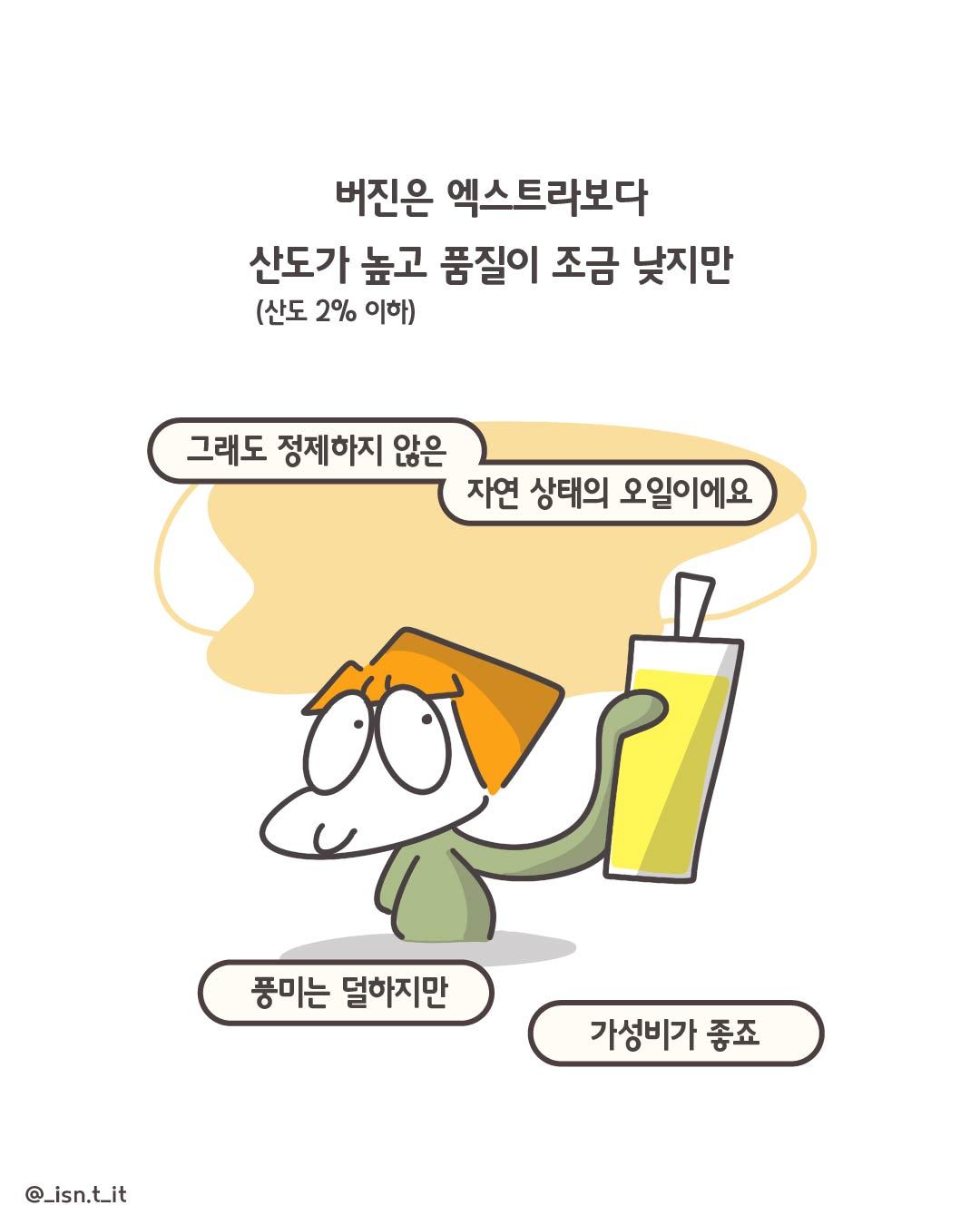(그래도 정제하지 않은 자연 상태의 오일이에요. 풍미는 덜하지만 가성비가 좋죠)