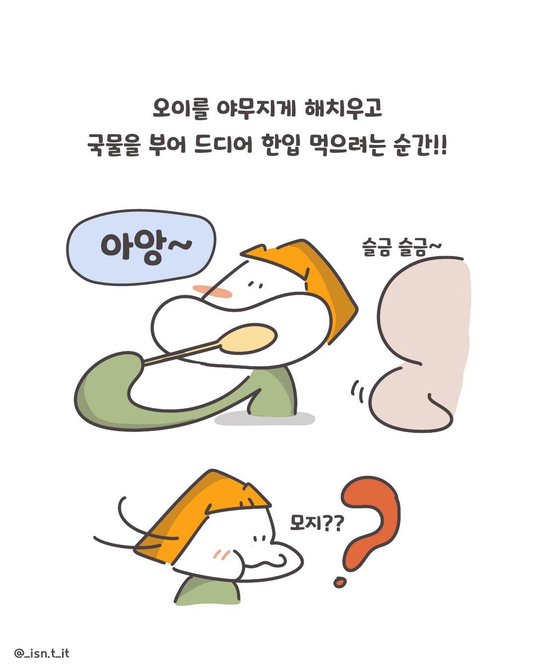 오이를 야무지게 해치우고 국물을 부어 드디어 한입 먹으려는 순간!!