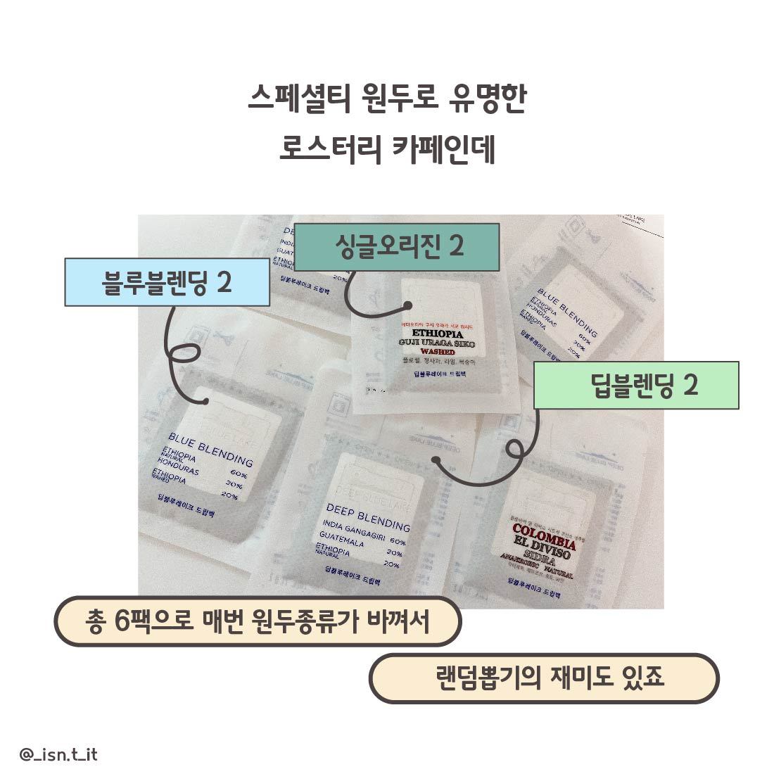 스페셜티 원두로 유명한 로스터리 카페인데 (블루블렌딩 2, 싱글오리진 2, 딥블렌딩 2 총 6팩으로 매번 원두종류가 바껴서 랜덤뽑기의 재미도 있죠)
