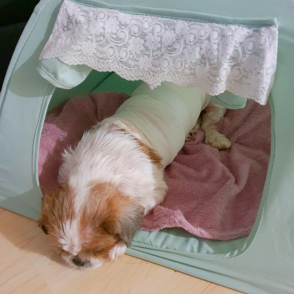 첫날에는 어찌나 끙끙 앓던지, A가 걱정되던 남편은 새벽 4시가 넘어서까지 잠들지 못했다. 갑자기 벌떡 일어서서 한 시간을 망부석처럼 서있기도 했다. 아마도 그 자세가 통증이 제일 적게 느껴지는 자세일 거라 추측했지만 밤새 서있기도 힘든 노릇이라 중간중간 뉘어주었다. 사흘째인 오늘은 이불이 더운지 자기 집으로 혼자 걸어가서 잠을 자기도 하고, 사료 냄새를 맡으면 펄쩍펄쩍 뛰기도 하며 잘 지내고 있다. 하루하루 차도가 보여 너무나 다행이다.