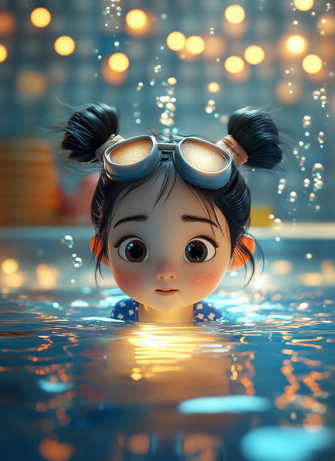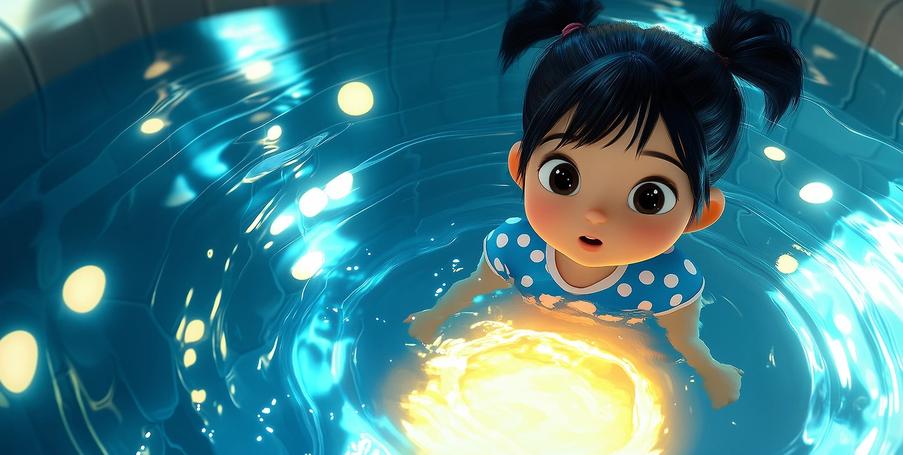 3D illustration of a magical swimming pool scene featuring a 5-year-old cut Korean girl, Lulu, with black hair tied in two pigtails, wearing a blue shirt with white polka-dot patterns. Lulu is underwater, peering down in amazement at a glowing, radiant door beneath the pool’s floor. The door emits a soft golden light, surrounded by swirling magical currents and sparkling particles, as if inviting her into another world. The transparent pool tiles reveal the enchanting portal below, with soft ripples and light beams enhancing the mysterious, magical atmosphere. Whimsical animation and surreal lighting —ar 192:97 —v 6.1