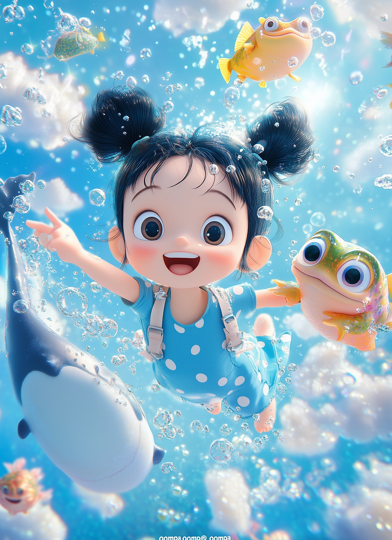 3D illustration of a 5-year-old cute Korean girl, Lulu, with black hair tied in two pigtails, wearing a blue shirt with white polka-dot patterns, joyfully swimming in an expansive sky world with her sea animal friends. Lulu laughs and ccalls out “oompa oompa” as she swims alongside a frinedly turtle, a playful whale, colorful fish, and cheerful frogs, all swimming as though gliding through water. Sparkling water droplets float and shimmer around them creating a magical and lively atmosphere. Fluffy white clouds and golden sunlight fill the sky, blending seamlessly with the radiant water-like environment. Whi, msical animation style, vbibrant colors, hd quality, dynamic and playfuhl composition —ar 8:11