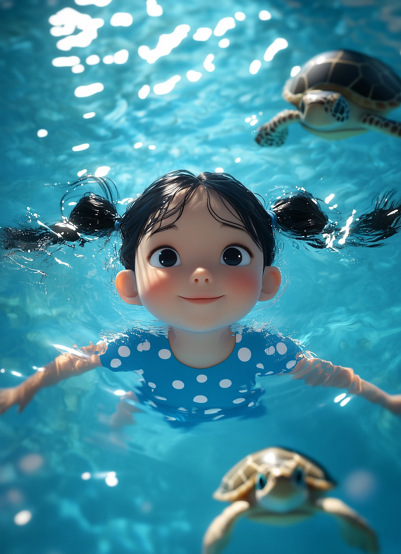 3D illustration of a 5-year-old cute Korean girl, lulu, with black hair tied in two pigtails, wearing a blue shirts with white polka-dot patterns, floating on her back as she practices backstroke in a sparkling swimming poo. Lulu smiles brightly as she gazes at the sky, surrounded by gentle ripples. Playful sea turtles swim gracefully nearby, their movements blending the magical feel of ocean life with the scene pool setting. Soft sunlight creates dazzling reflections on the water, enhancing the peaceful, whimsical atmosphere. animation style, vivid colors, hd quality —ar8:11 —v 6.1