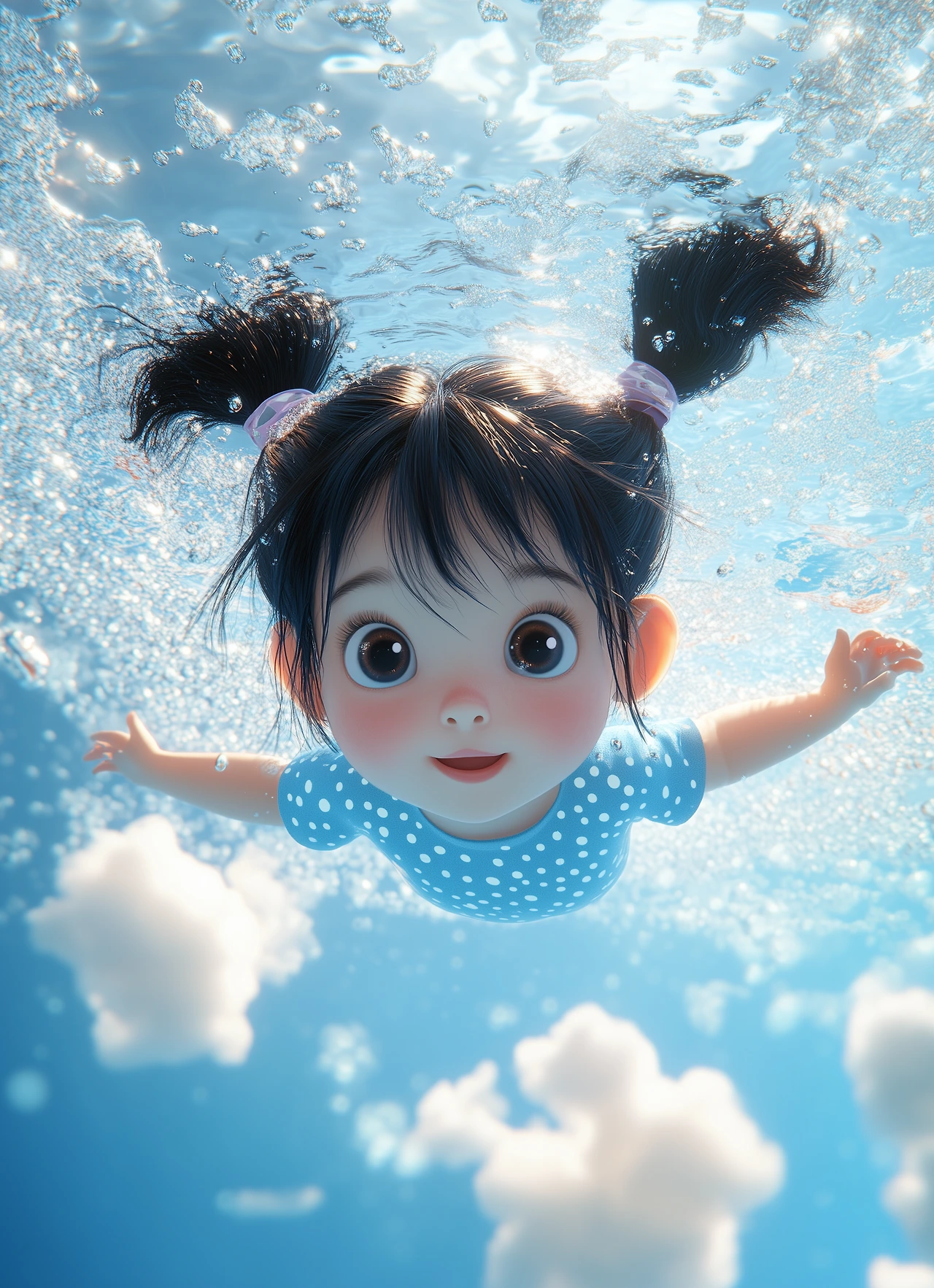 3D illustration of a 5-year-old cute Korean girl, Lulu, with black hair tied in two pigtails, wearing a blue shirt with white polka-dot patterns, diving underwater in a sparkling swimming pool. Lulu gazes in wonder as the pool’s bottom transforms into a magical portal, revealing an expansive sky world beneath her. Fluffy white clouds float gently, and golden sunlight beams through a ivid blue sky, creating a surreal and dreamlike atmosphere. The edges of the portal shimmer with soft glowing light, blending the pool and sky seamlessly. Whimsical animation style, vibrant colors, hd quality, ethereal and magical lighting —ar 8:1 —v 6.1