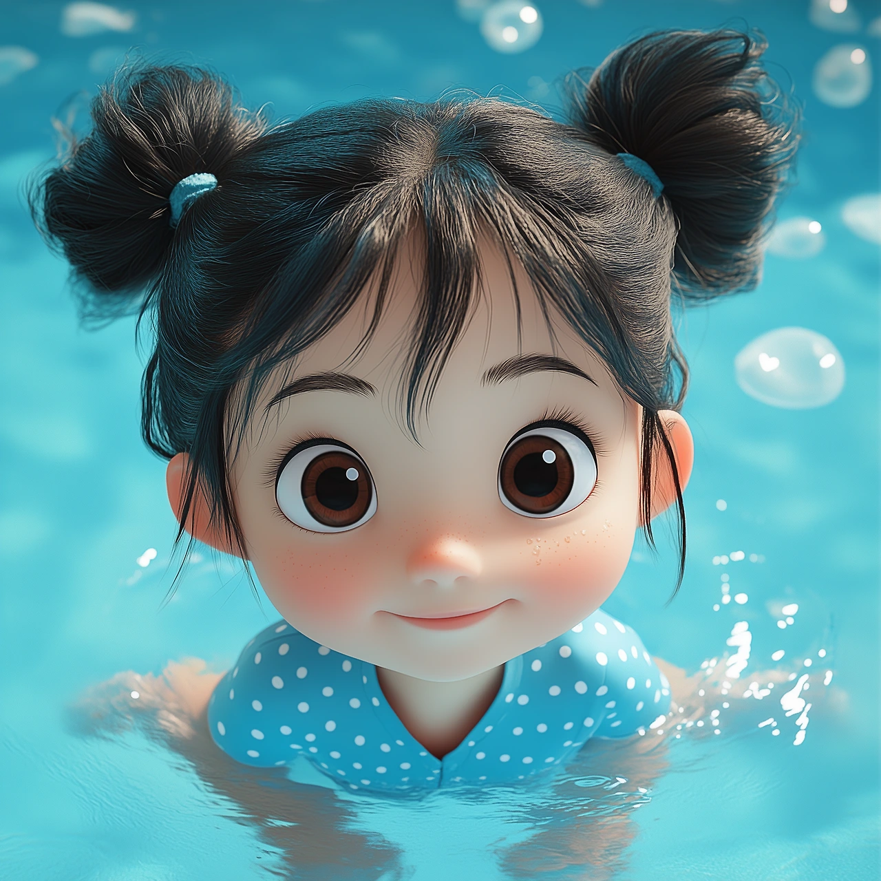 3D illustration of a 5-year-old cute Korean girl, Llu, with black hair tied in two pigtails, wearing a blue shirts with white polka-dot patterns, swimming freestyle in a crystal-clear swimming pool. Lulu’s arms stretch forward confidently, creating ripples in the water, while colorful fish swim playfully around her, adding a magical touch to the scene. The pool tiles glisten below, and soft sunlight filters through the water, creating dynamic light reflections. Whimsical animation style, vivid colors, hd quality —ar 8:11 —v 6.1