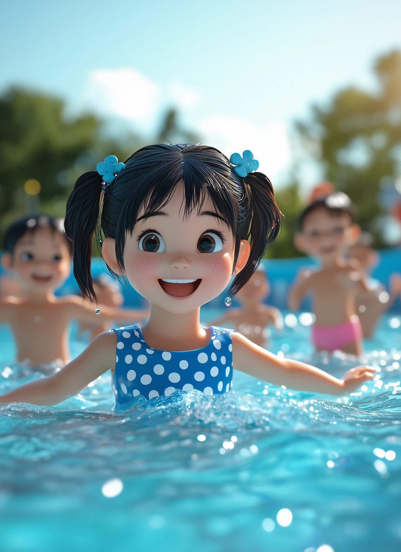 3D illustration of a joyful scene featuring Lulu, a 5-year-old cute Korean girl with black hair tied in two pigtails, wearing a blue shirts with white polka-dot patterns. She stands at the poolside, smiling brightly as her swimming teacher bends down to greet her with a warm exxpression. Around them, her 5-year-old swimming friends wave excitedly from the water, splashing playfully. The swimming pool glistens under soft natural light, with gentle reflections creating a lively atmosphere. animation style, vivid colors, hd quality —ar 8:11 —v 6.1