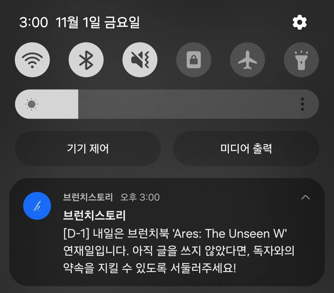 토요일 연재를 시작하기로 했던 'Ares: The Unseen Wings'의 시나리오를 작성하지 않았는데, 어떻게 알고 브런치 스토리에서 알림을 보내주었습니다.