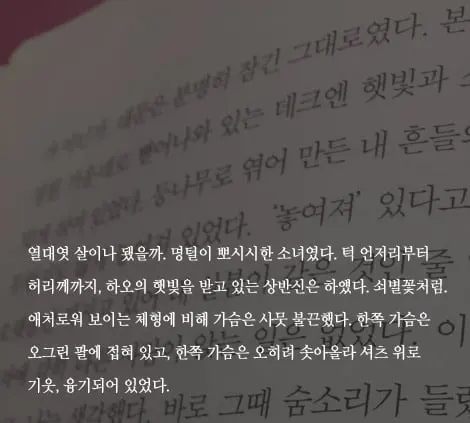 70대의 노인은 어느 날, 집 앞 마당 흔들의자에 '놓여져' 있던 열일곱 소녀의 모습에 문득 깨어난 갈망을 이렇게 변명한다. '내 늙음은 벌이 아니다'라고.