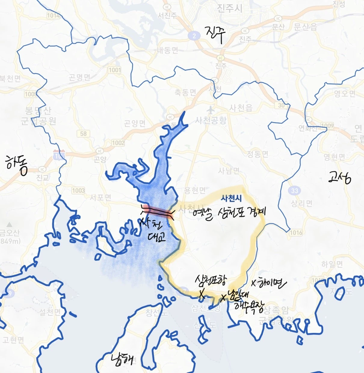 일단 삼천포로 들어가기 전에, 사천시의 전체 지도를 한번 구경해보면 이거 참 희한하게 생겼다 싶을 거다. 한려해상국립공원에 속해있을 만큼 섬도 많고 바닷가 해안선도 구불구불하게 만들어져있다는 것을 알고 있다. 하지만 사천시가 바다와 맞닿아 있는 방식은 유독 특이하다. 마치 바다가 사천시를 딱 두 개로 쪼개버리려는 듯 육지를 깊이 파고 들어갔다. 이쯤이 되면 바다를 중심으로 두 개 지역으로 쪼갤 법한데, 인간의 행정구역은 바다를 초월했나 보다. 바다가 갈라놓은 두 개 지역을 연결해주는 것은 거대한 사천대교다. 사천시 이곳저곳을 오고 가다 보면 하루에도 두 세 번씩 이 다리를 건너게 된다.