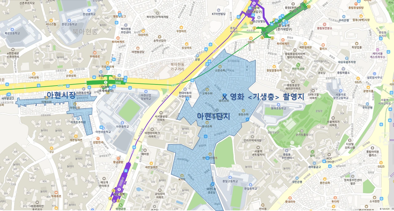 이런 지리적 특성 때문에 ‘기생충’의 스틸 컷에는 엄청난 경사의 계단이 보인다. 파란색 표지판을 자세히 보면 이 골목은 아현동 ‘환일1길’이라는 것을 알 수 있다. 이곳을 방문하면 영화 속 장면처럼 경사지고 가파른 언덕에 오래된 빌라가 빽빽이 모여 있다. 이 지역에 재개발 사업이 추진된 지 20년이 넘었지만, 몹시 더디게 진행되다 보니 동네가 전반적으로 낡았다. 그러는 사이 아현1구역(699번지)이라 불리는 이곳을 제외한 대부분의 아현동 일대는 뉴타운으로 바뀌었다.