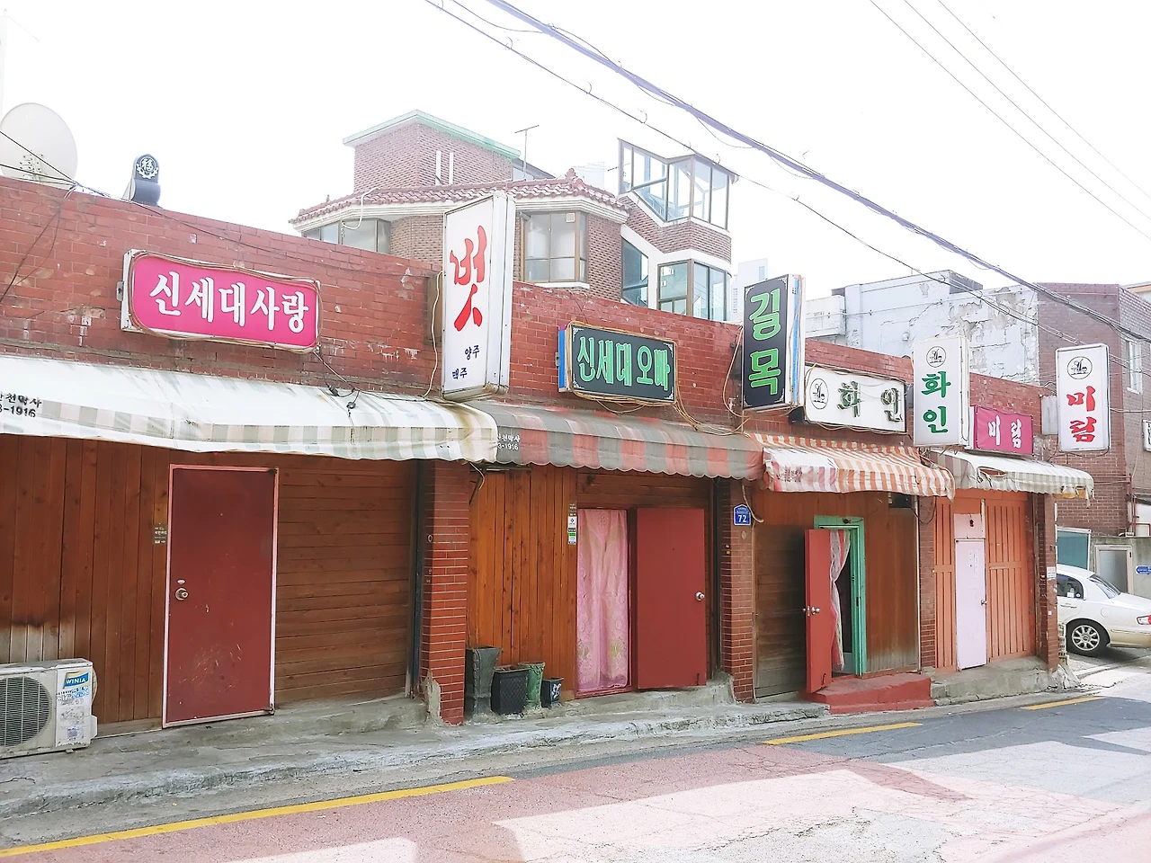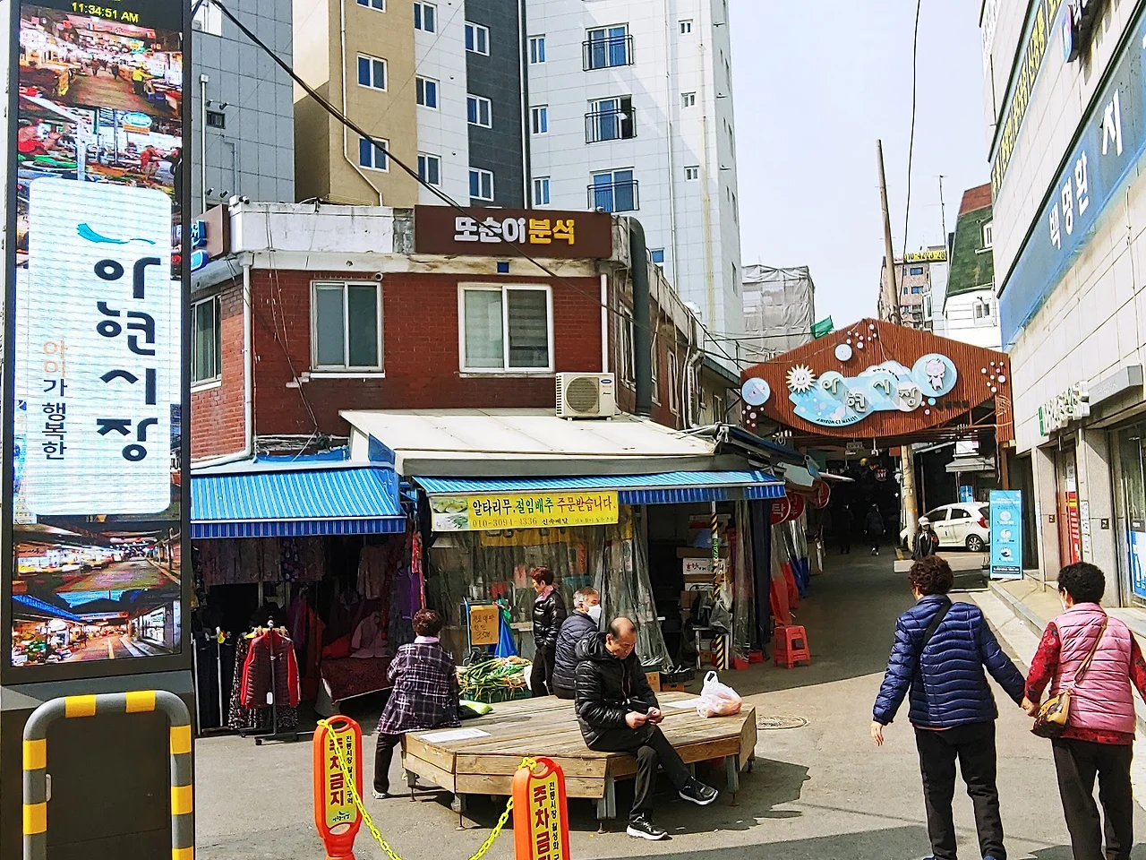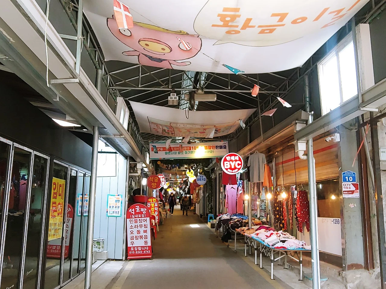 시장이라면 역시 먹거리가 빠질 수 없지. 혹여나 주전부리를 파는 집을 하나라도 놓칠세라 입구에 들어서면서부터 양옆에 늘어선 가게를 매의 눈으로 스캔했다. 가는 날이 장날인 것인지 장날이 아닌지, 안쪽으로 들어갈수록 문을 연 곳이 몇 군데 없다. 점점 더 빈 매장이나 문 닫은 가게가 많이 보인다. 더 안쪽에 더 맛있는 것이 있을지 모른다며 입구 쪽 가게들을 모른 척했던 것이 후회됐다. 그나마 눈이라도 즐거워서 다행이랄까. 비가 오는 날에도 우산을 쓰지 않고 장을 볼 수 있도록 비 가림막을 씌워놨는데, 곳곳에 시장에 관련된 아이들의 그림으로 채워져 있었다. 더 깊숙이 시장 안쪽으로 들어가니 둘이 어깨를 나란히 하고 걸으면 자주 길을 비켜주어야 할 만큼 길이 좁아진다. 좁은 골목 틈으로 선녀보살 같은 간판을 내걸고 있는 집이 보이기 시작하더니, 갑자기 시장이 끝났다. 그리고 그 너머로 거대한 아파트 단지가 들어서고 있었다.