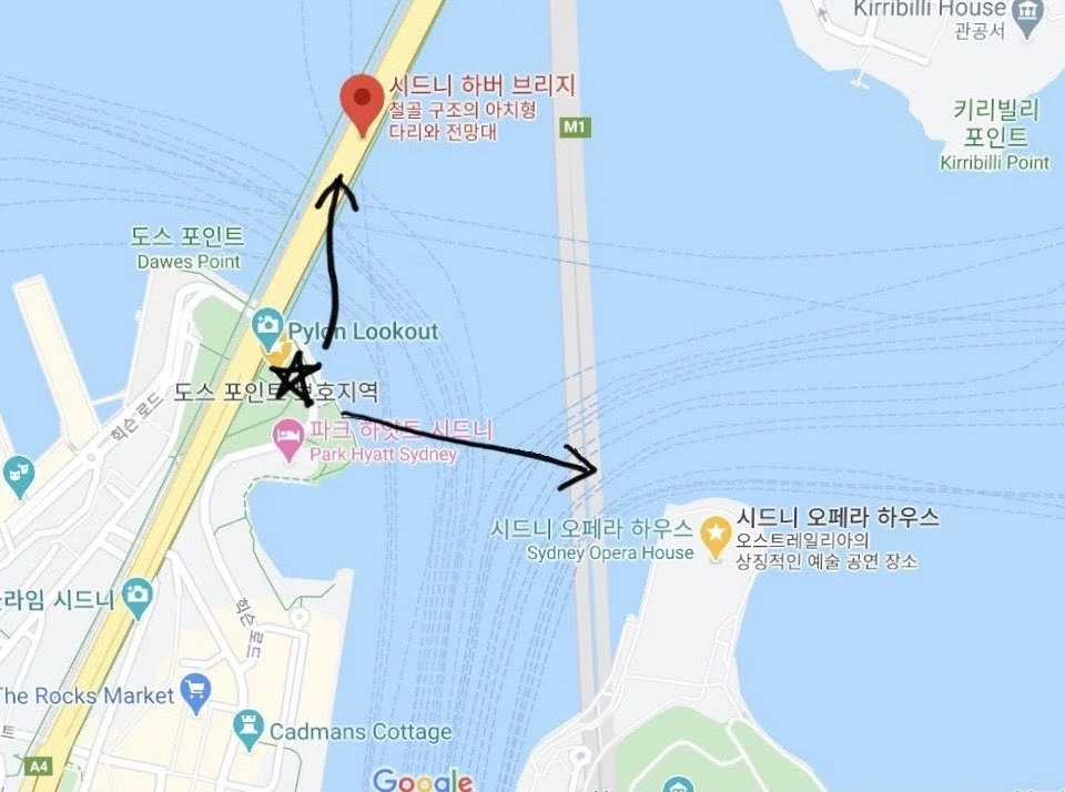 이 느낌 그대로 호주 와인을 호로록 마시면 눈물이 또르르 날 것만 같은 벅찬 마음이건만, 그가 권한 건 노천 카페의 폼나는 와인 한 잔이 아니었다. 그에게는 아직 한국 감성이 남아 있었나 보다. 한국에서 소주랑 안줏거리 사들고 해수욕장에 앉아 밤바다를 보는 맛을 못 잊었던 건지, 계나에게 마트에서 술과 안주를 사와 바닷가에 앉아서 먹자고 권했다. 그들은 그렇게 마트에서 3,000원도 안하는 2리터 짜리 종이 팩에 담긴 와인과 나쵸칩을 사서, 도스 포인트 공원이라는 곳에 자리를 잡고 오페라 하우스를 바라보며 술을 마셨다. 지도만 봐도 하버 브리지부터 오페라 하우스까지 한눈에 들어오는 위치라는 걸 알 수 있다. 거기에 와인까지 홀짝거리니 그 풍경이 오죽 아름다웠을까.
