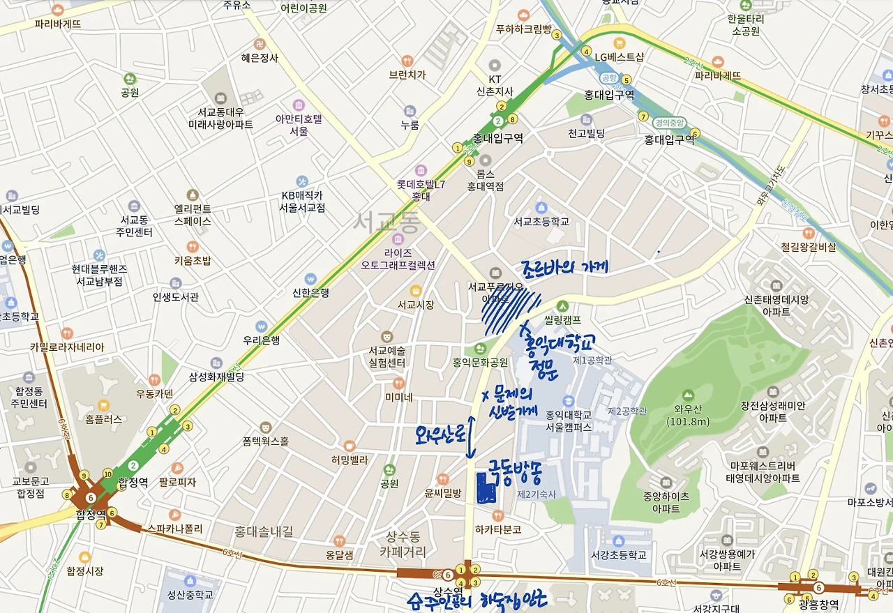 책에서는 극동방송국을 랜드마크로 삼았지만, 신발 좀 좋아하는 사람이라면 와우산로라는 이름에서 운동화를 떠올릴 것이다. 홍대 정문에서 상수역을 향해 걸어가다 보면 외관부터 독특한 가게를 하나 만날 수 있다. 일반 매장과는 달리 스니커즈를 중심으로 하는 콘셉트 매장이다. 매장에 들어가면 한 번도 본 적 없는 디자인의 신발이 줄지어 늘어선 모습에 넋이 빠지지만, 진짜 특이한 모습은 새벽에만 볼 수 있다. 한정판 디자인이 출시되는 날이면 수십 수백의 사람들이 밤새 줄을 서는 진풍경이 벌어진다. 만약 한정판 신발이 출시되는 날이었다면 주인공의 첫사랑은 차마 노상방뇨를 할 용기를 낼 수 없었을 것이고, 주인공을 만나지도 못했을 것이다.