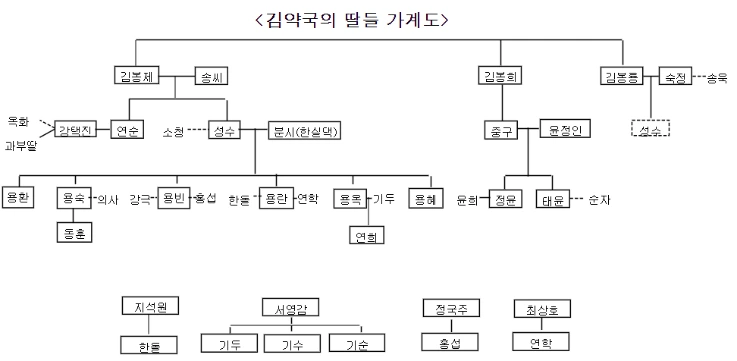 그런 점에서 <김약국의 딸들>도 쉬운 책은 아니다. 주로 김약국의 딸들이 주요 인물이지만, 이야기는 그 할아버지 때부터 시작되면서 모든 가족 구성원이 줄줄이 소개된다. 특히 다섯 딸이 모두 ‘용’자 돌림의 이름을 가지고 있기 때문에 “용란이가 둘째인 줄 알았지? 사실 셋째지롱, 용용 죽겠지”라고 약을 올린다. 인터넷에 “김약국의 딸들 가계도”가 돌아다니는 데에는 다 이유가 있는 거다. 아직 김약국의 딸들을 읽지 않았다면 꼭 가계도를 참고하면서 읽기를 추천한다.