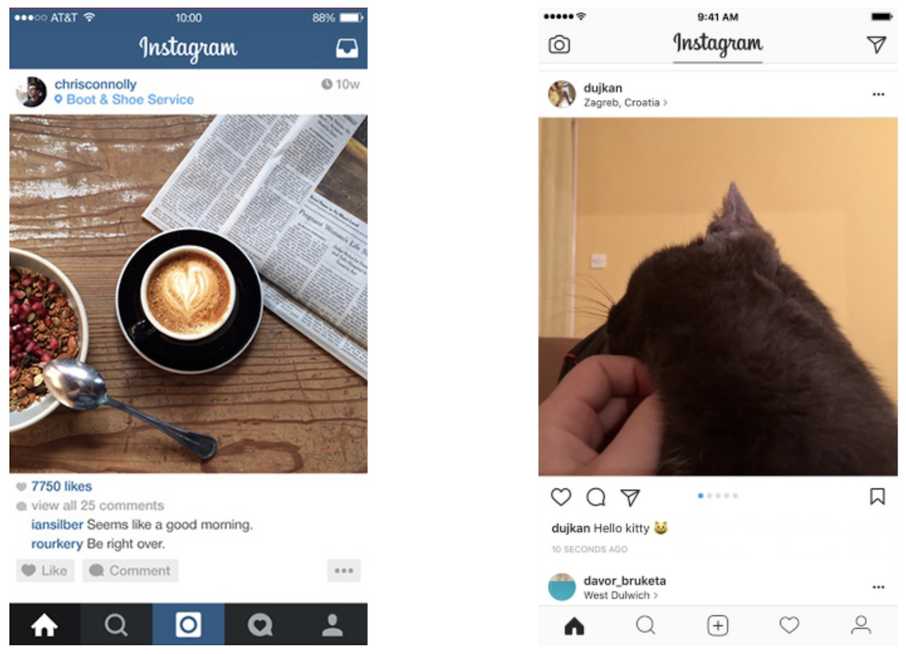 콘텐츠에 집중된 디자인은 Instagram, Apple(iOS 10)의 UI 변화 시기에 쏟아져 나왔는데, 조금씩 다르긴 하지만 당시 트렌드는 콘텐츠가 중심에 있다는 것은 모두 똑같은 소리를 내고 있는듯했다. 물론 이런 디자인에 대해 최근 개성이 없다라고 말하는 사람들도 있는데, PC에서 모바일로 완전히 넘어온 지금 어쩌면 당연한 변화일지도 모르겠다는 생각을 해본다.