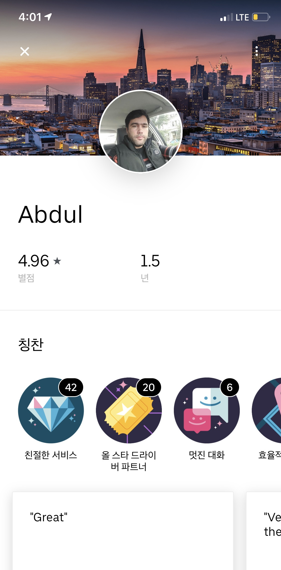 또한 운행 종료 후 별점 5개 이하는 부족한 부분을 체크, 아이콘으로 칭찬을 할 수 있고 또 TIP(기본 1$, 3$, 5$) 을 줄 수도 있는데 이것으로 드라이버의 평가가 자연스럽게 구축되고 시스템은 물론 사용자도 참고를 한다. 그리고 드라이버도 이 부분을 자연스럽게 인지하고 의식하며 서비스를 행한다.