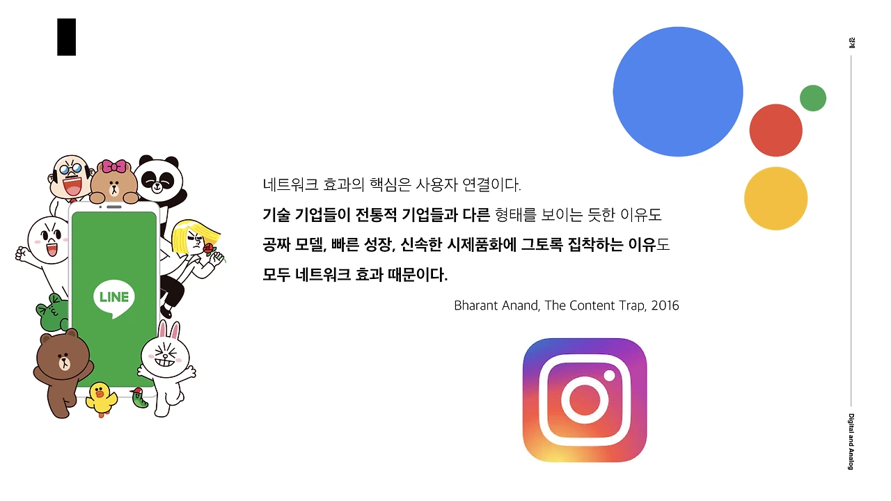 라인, 페이스북, 인스타그램, 영상 통화 등의 네트워크 제품은 얼마나 많은 사람이 그 제품을 구매하고 사용하는지 즉, 사용자 간의 네트워크 효과를 일으키는 서비스가 중요 해졌다고 합니다.