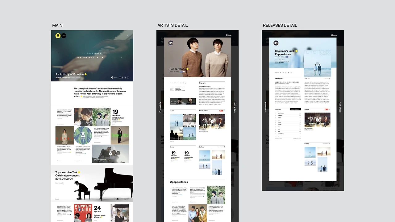 그래서 사이트 콘텐츠를 Antenna, News, Release, Artist, Event, #Antenna로 구분하고, 사이트에 접속할 때마다 메인 페이지의 콘텐츠 구성이 섞여 새로워 보이게 만들어줬습니다.