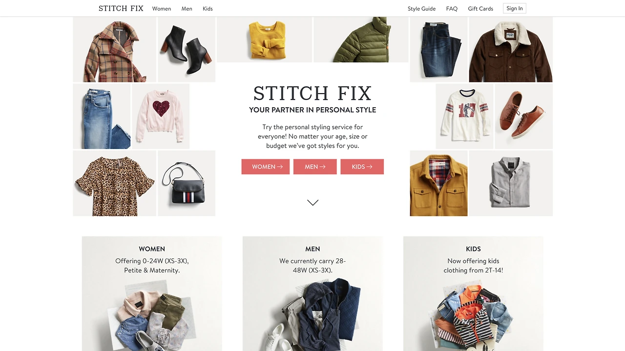 STITCH FIX는 고객의 STYLE, SIZE, PRICE에 맞게 스타일링을 제안하고 구독료(20달러)를 받습니다. 고객은 배달 온 모든 항목을 구매하면 25% 할인하여 구매가 가능하고 반품은 무료입니다.