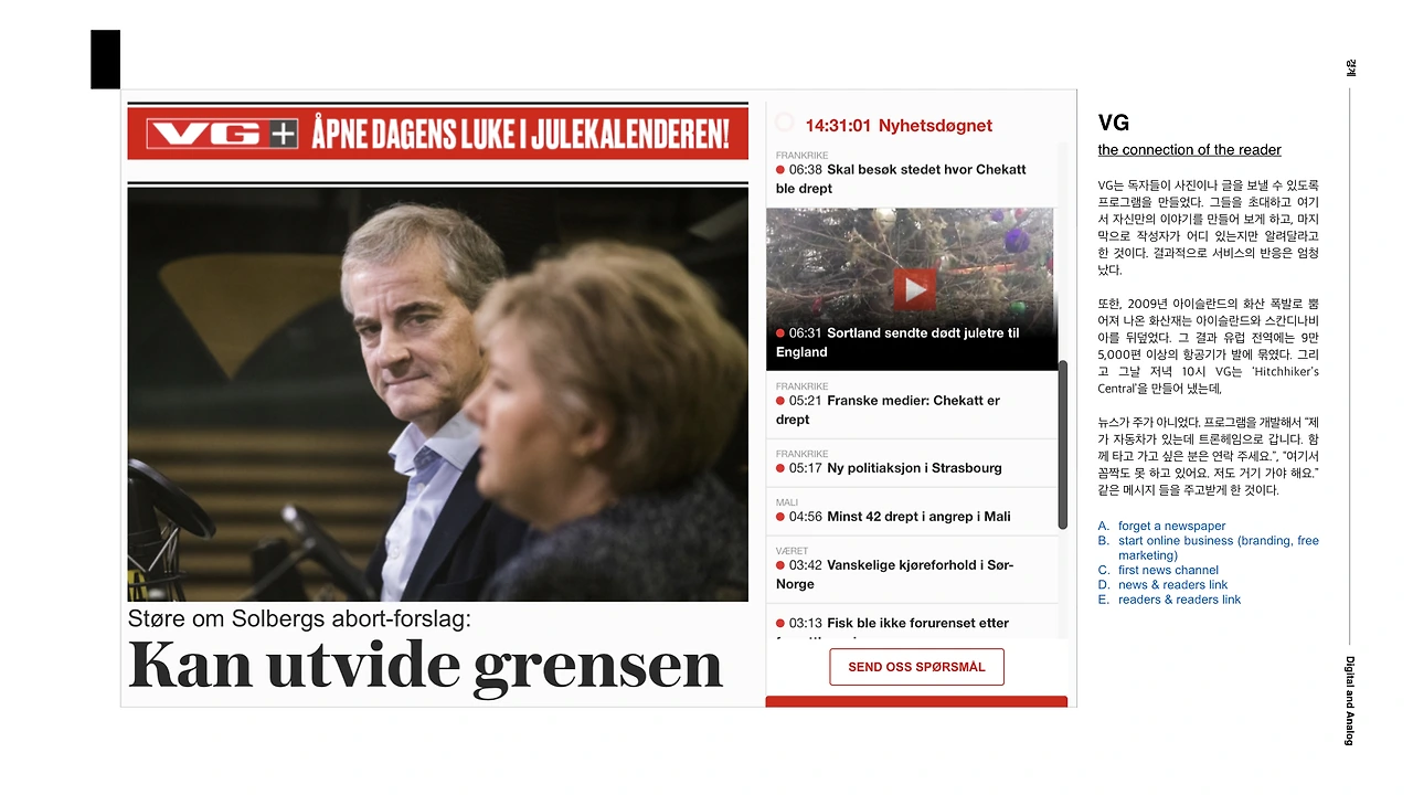 그 후도 VG는 기사가 아닌 독자들의 연결에 답이 있다고 판단했고, 독자들이 사진이나 글을 보낼 수 있도록 프로그램을 만들었다. 대신 작성자가 어디 있는지만 표기하면 됐었습니다. 그리고 2009년 아이슬란드 화산 폭발이 있었을 때 이들은 독자들끼리 연락해서 차를 타고 이동할 수 있도록 했습니다.