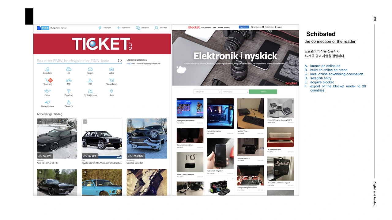 그리고 스웨덴의 온라인 광고사 B2C에 C2C 기능까지 가진 온라인 광고사 ‘Blocket’을 인수하며 점차 세력을 확대하고 이와 같은 모델은 20개국에 수출합니다.