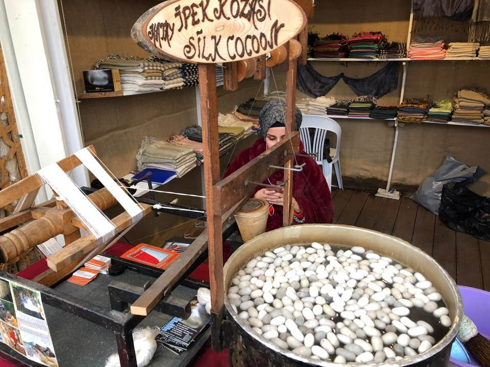 터키는 섬유기술이 뛰어나서 실크의 품질이 아주 좋다. 시장에만 가도 아라베스크 무늬부터 크림트나 고흐의 그림까지 다양한 프린트의 스카프가 널려있다. 관광지답게 누에고치에서 실을 짜내는 퍼포먼스를 더해 스카프 장사를 하는 가게 주인의 아이디어가 기발했다. 가게를 지키는 저 뒤에 알바 언니는 주인의 마음을 아는지 모르는지 전통 복장까지 곱게 차려입고 SNS 삼매경에 빠져 가게로 들어오는 손님은 아얘 신경도 안 썼다. 덕분에 나랑 후는 실타래가 만들어지는 모습을 실컷 보고 스카프 한 장 사볼까 하는 고민도 필요 없이 가게를 나 올 수 있었다.