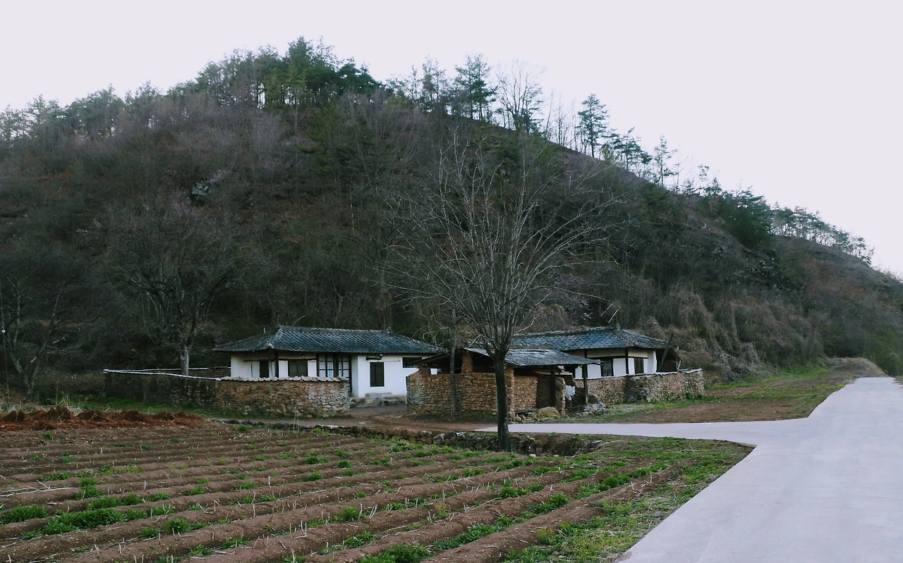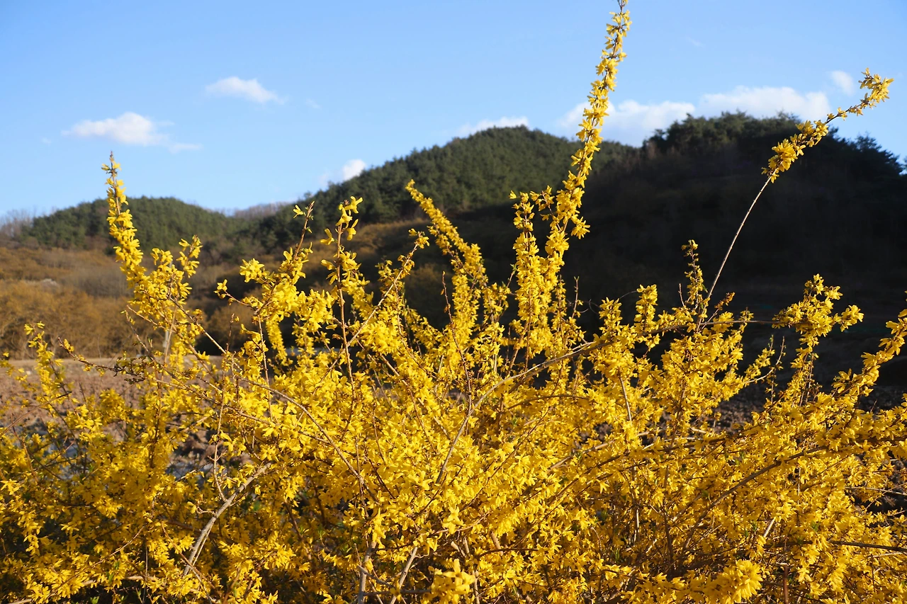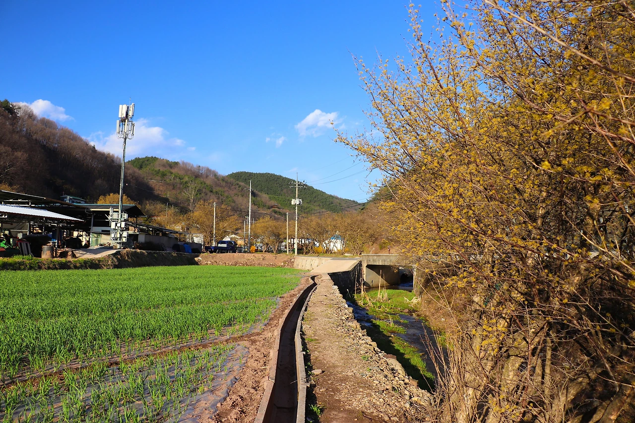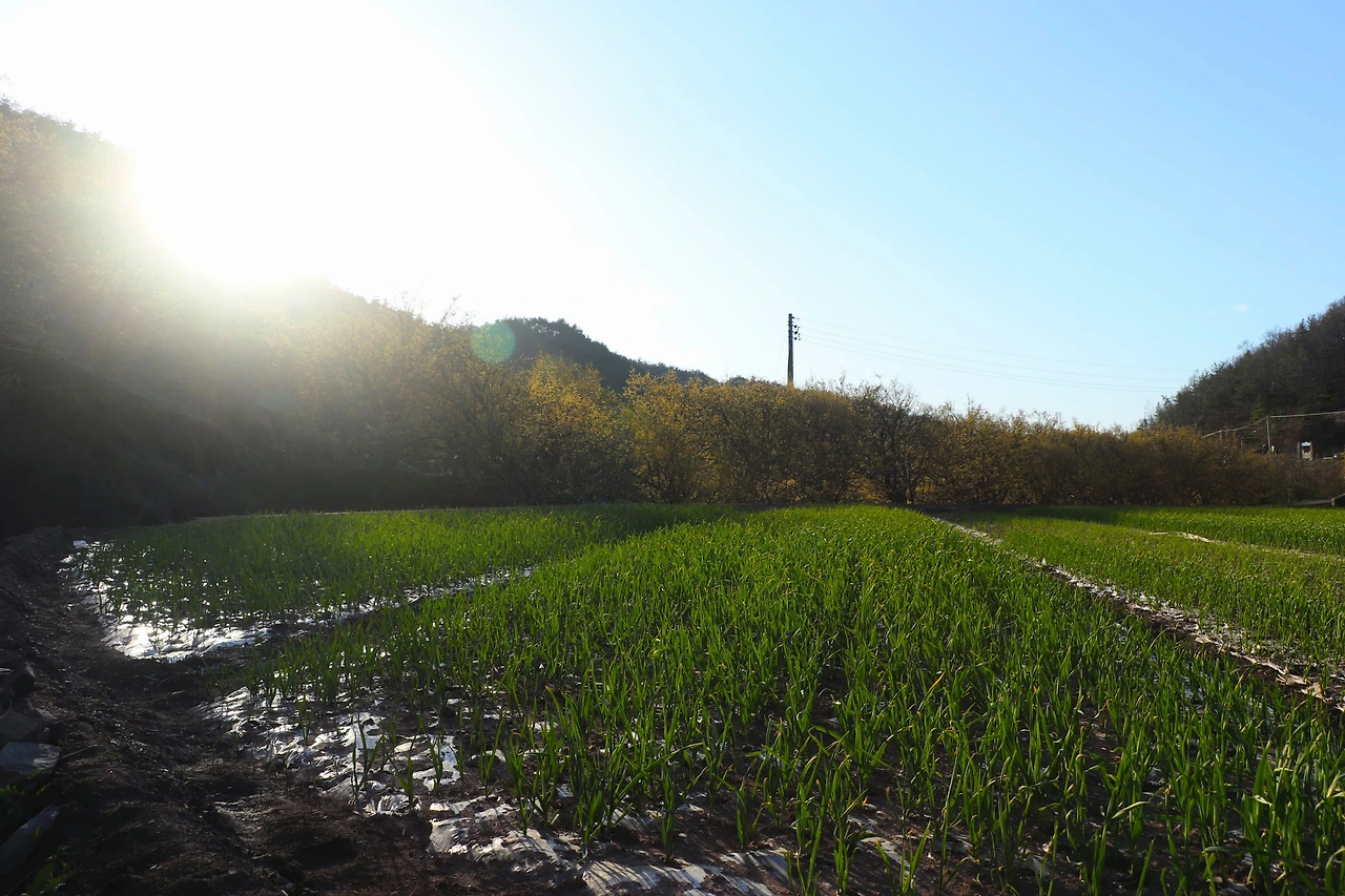파주 이야기만 늘어놓았는데, 사실 <리틀 포레스트>는 경상북도 의성과 군위를 배경으로 한다. 우린 우선 의성에 있는 산수유마을에 갔다. 산수유 축제 기간이라 주차장이 곳곳에 마련되어 있고 주차관리를 하는 사람들도 서 있었다. 행사가 이미 끝났는지 광대 분장을 아직 지우지 않은 아저씨가 길에서 통화를 하고 있었고, 천막과 플라스틱 테이블들이 비어있었다. 나는 지방에서 ‘00 축제, 00 공연, 전통놀이대회 등 각종 부대 행사’라고 쓰인 현수막을 걸고, 노점상을 열고, 트로트를 틀어 시끌벅적한 분위기를 만드는 행사를 별로 좋아하지 않아서 때마침 잘 도착했다고 생각했다. 축제를 보고 나온 듯한 마을 할머니, 할아버지들이 하나 둘 집으로 돌아오던 시간이었다. 온화한 봄의 햇빛이 노란 산수유꽃과 연둣빛 마늘밭에 내려앉기 시작한다. 주인공 혜원이 자전거를 타고 지나간 길에 석양까지 더해진 풍경. 이곳에서 차를 타고 30분 정도 더 가면 군위군 우보면에 혜원의 집이 있다.