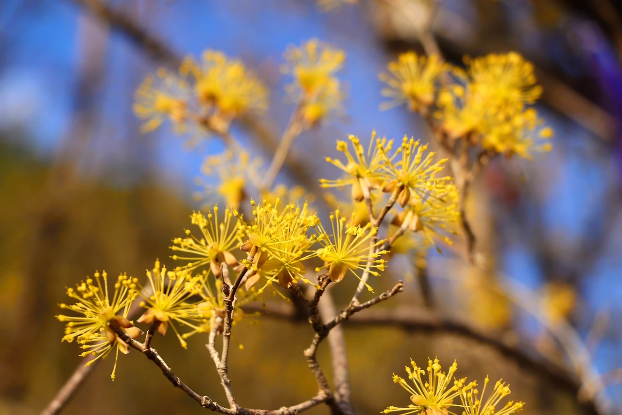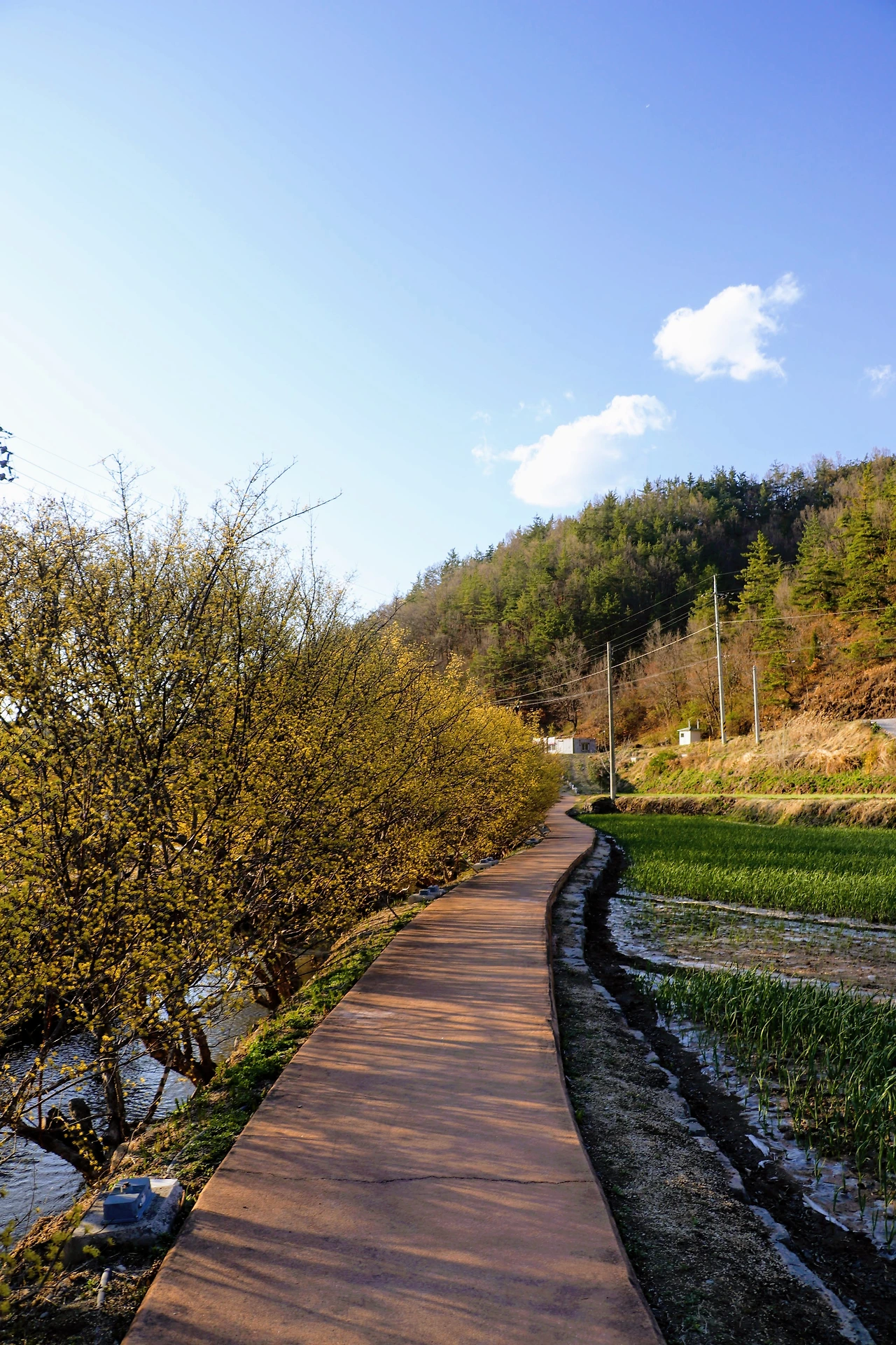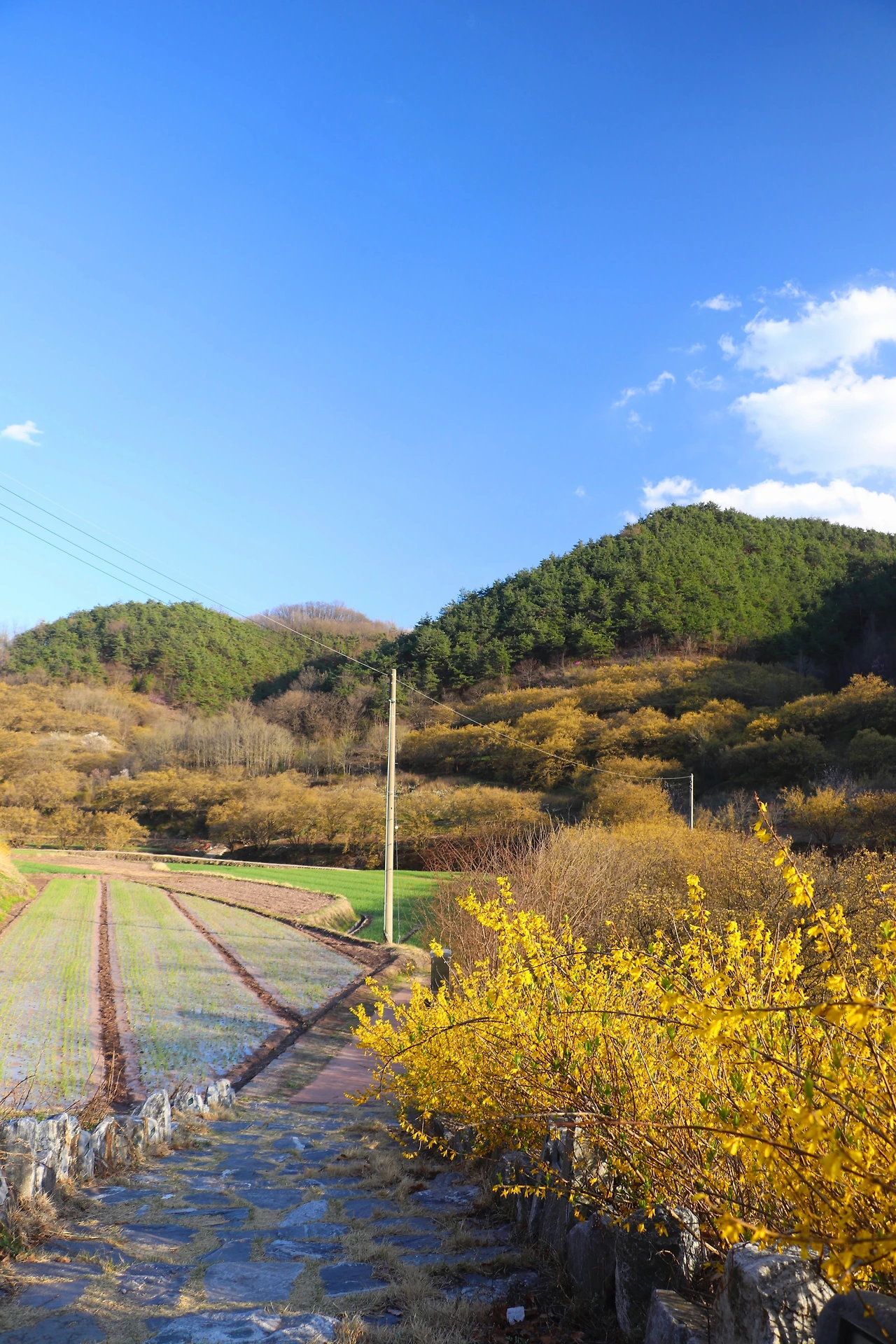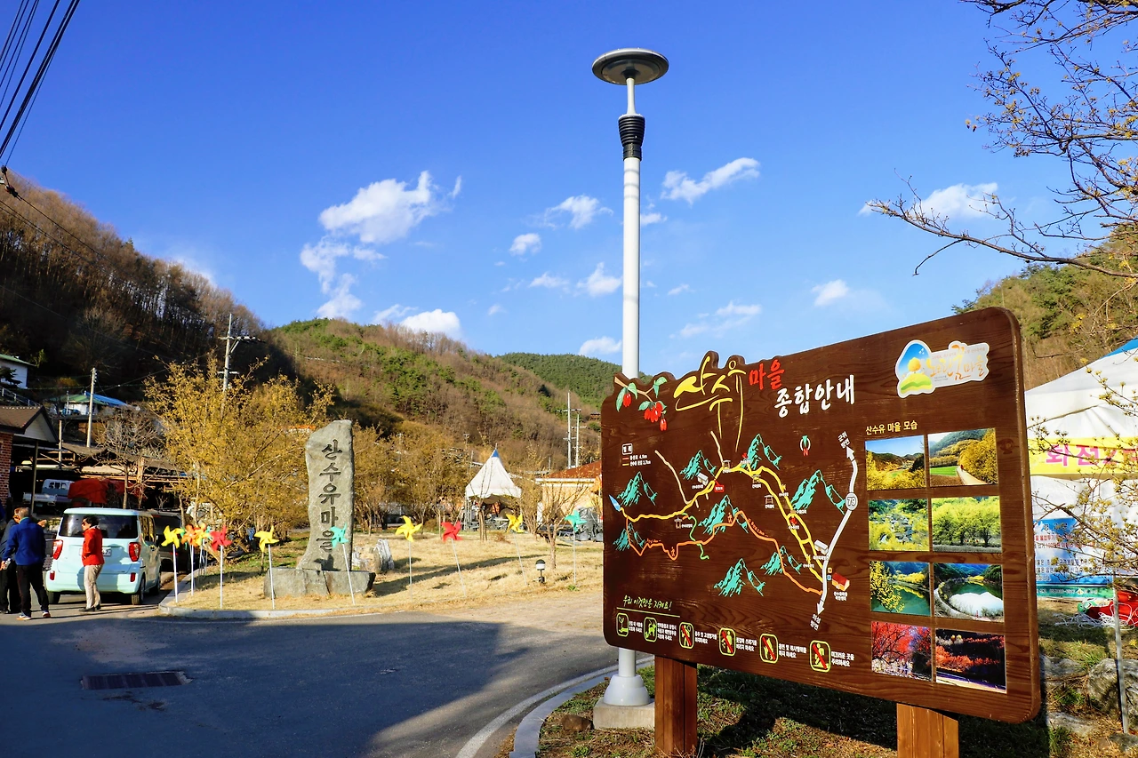 파주 이야기만 늘어놓았는데, 사실 <리틀 포레스트>는 경상북도 의성과 군위를 배경으로 한다. 우린 우선 의성에 있는 산수유마을에 갔다. 산수유 축제 기간이라 주차장이 곳곳에 마련되어 있고 주차관리를 하는 사람들도 서 있었다. 행사가 이미 끝났는지 광대 분장을 아직 지우지 않은 아저씨가 길에서 통화를 하고 있었고, 천막과 플라스틱 테이블들이 비어있었다. 나는 지방에서 ‘00 축제, 00 공연, 전통놀이대회 등 각종 부대 행사’라고 쓰인 현수막을 걸고, 노점상을 열고, 트로트를 틀어 시끌벅적한 분위기를 만드는 행사를 별로 좋아하지 않아서 때마침 잘 도착했다고 생각했다. 축제를 보고 나온 듯한 마을 할머니, 할아버지들이 하나 둘 집으로 돌아오던 시간이었다. 온화한 봄의 햇빛이 노란 산수유꽃과 연둣빛 마늘밭에 내려앉기 시작한다. 주인공 혜원이 자전거를 타고 지나간 길에 석양까지 더해진 풍경. 이곳에서 차를 타고 30분 정도 더 가면 군위군 우보면에 혜원의 집이 있다.