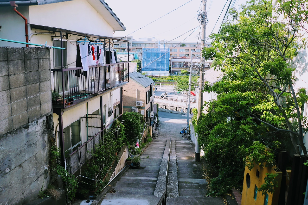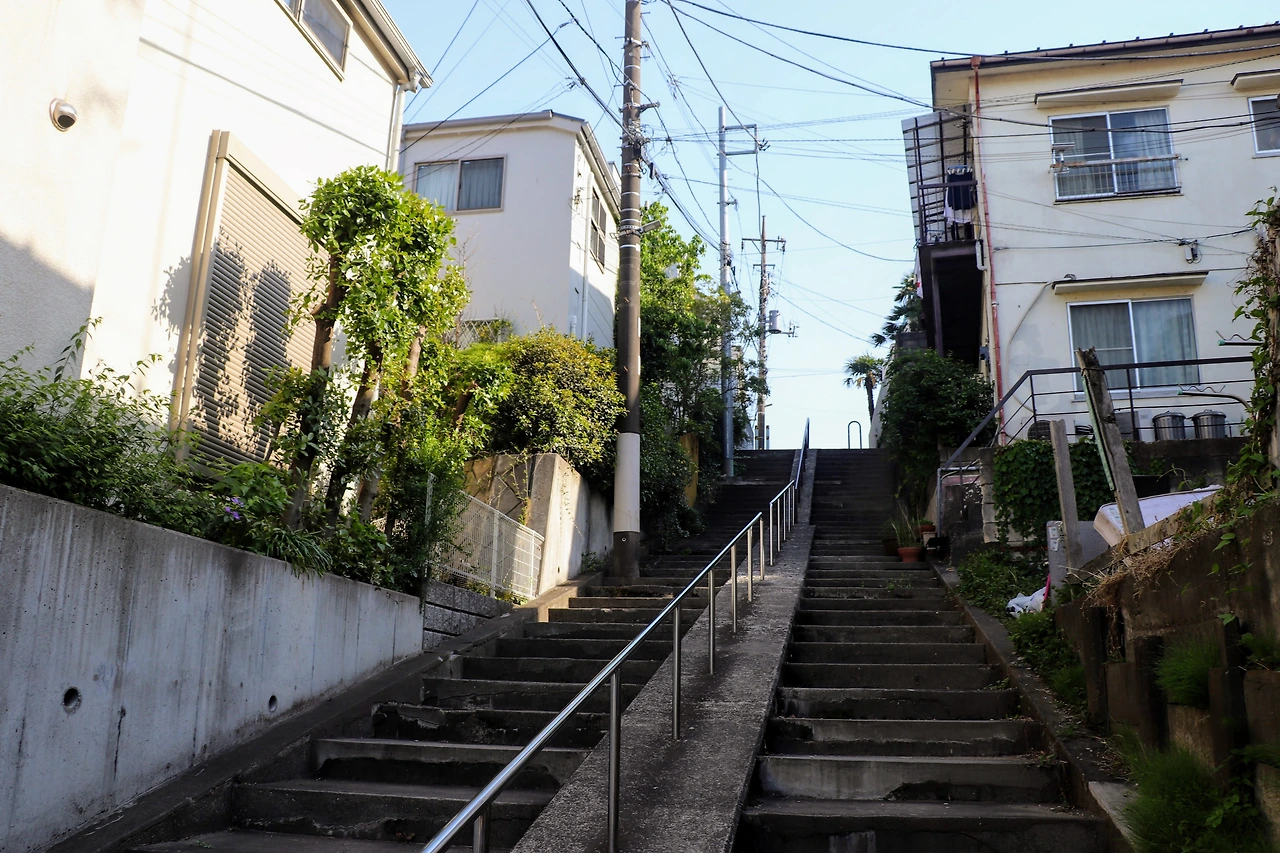 공원 곁에 가파른 계단이 하나 있다. 주인공 아키라가 자주 오르내리는 계단이지만, 나는 이 계단을 실제로 보니 막내 유키의 얼굴이 가장 먼저 떠올랐다. 아이들은 가위바위보를 해서 이긴 사람이 계단을 올라가는 게임을 하는데, 가장 밑에 있는 유키가 정말 작아 보이기 때문이다. 어린 시절 나만 한참 밑에 있고 위로 먼저 올라간 친구들이나 사촌들을 올려다볼 때 그 초조함. 이곳에 서 있으니 어린 시절 느꼈던 그 기분이 되살아나서 아랫배가 살짝 아파왔다.