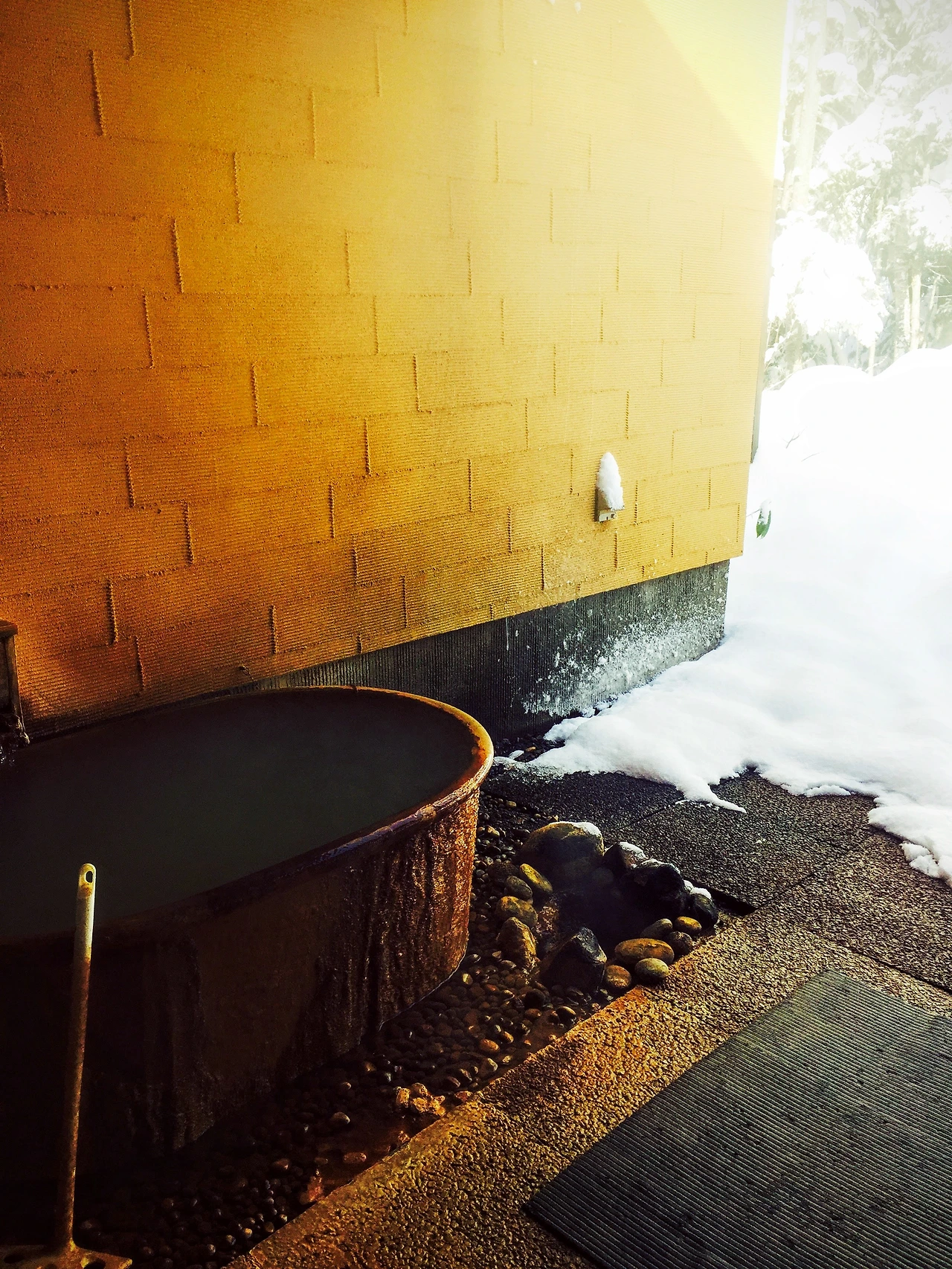 예약한 료칸엔 숙박하는 사람이 많지 않았다. 이틀 동안 넓은 대욕탕을 혼자 썼다. 노천탕에는 한 명만 쏙 들어갈 수 있는 통이 하나 놓여 있었다. 통 바로 앞에는 눈이 쌓여 있었고, 눈에 반사된 아침햇살에 눈이 부셨다.