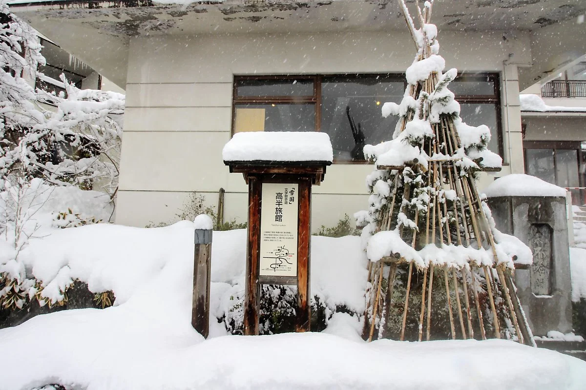 시마무라가 머무는 료칸은 작품의 주요 배경이 된다. 작가는 실제로 에치고 유자와의 다카한 료칸 高判旅館 에 머물며 설국을 집필했다. 증축을 한 다카한은 옛 모습이 남아 있지 않지만 위치는 그대로여서 소설의 묘사와 이질감이 없다. 예약이 어려울 줄 알았는데 의외로 전날 예약이 가능했다. 역에서 내리자마자 눈이 펑펑 내리는 길을 걷고 싶다는 신랑을 만류하고 료칸에 전화를 걸어 데리러 와달라고 했다.