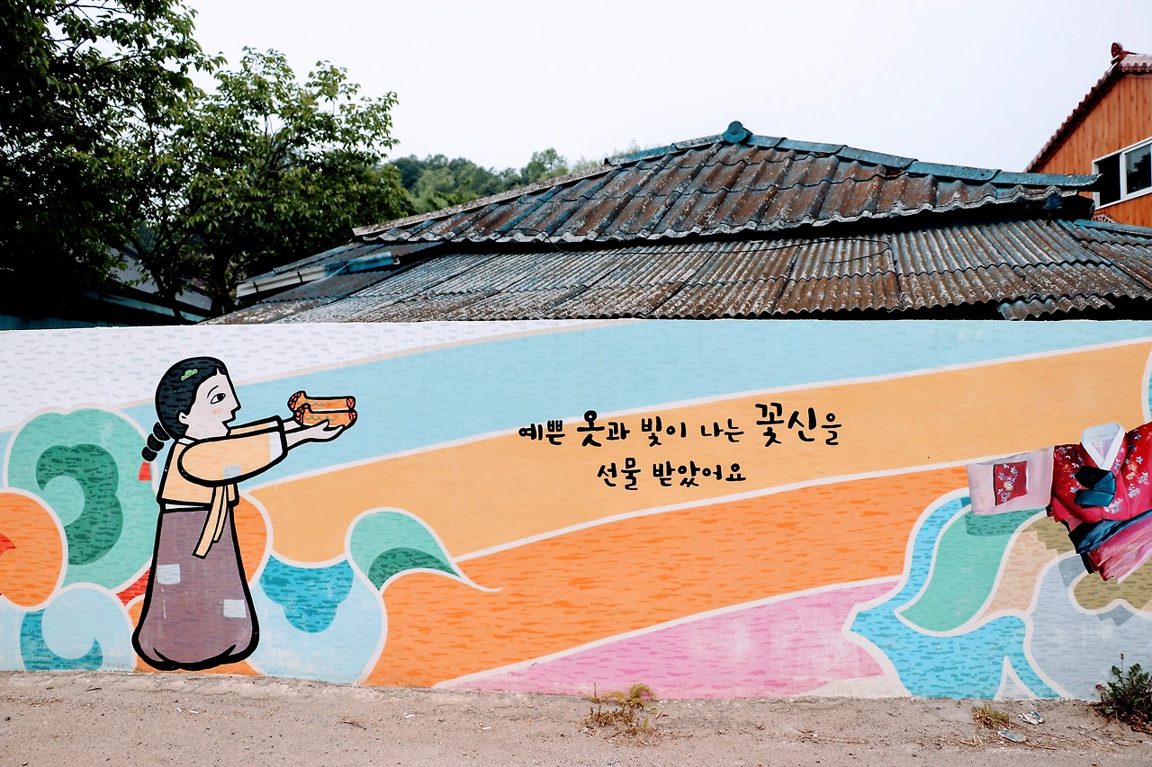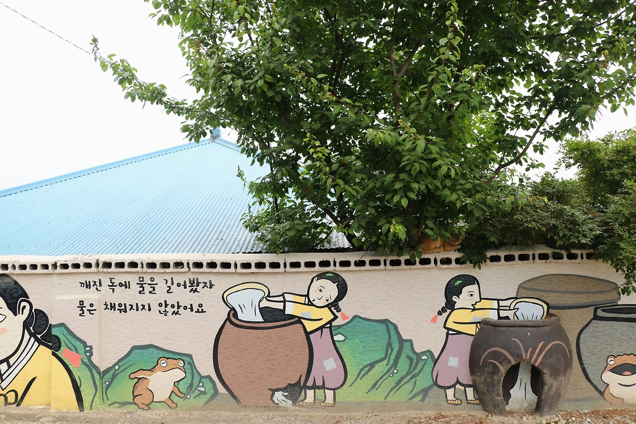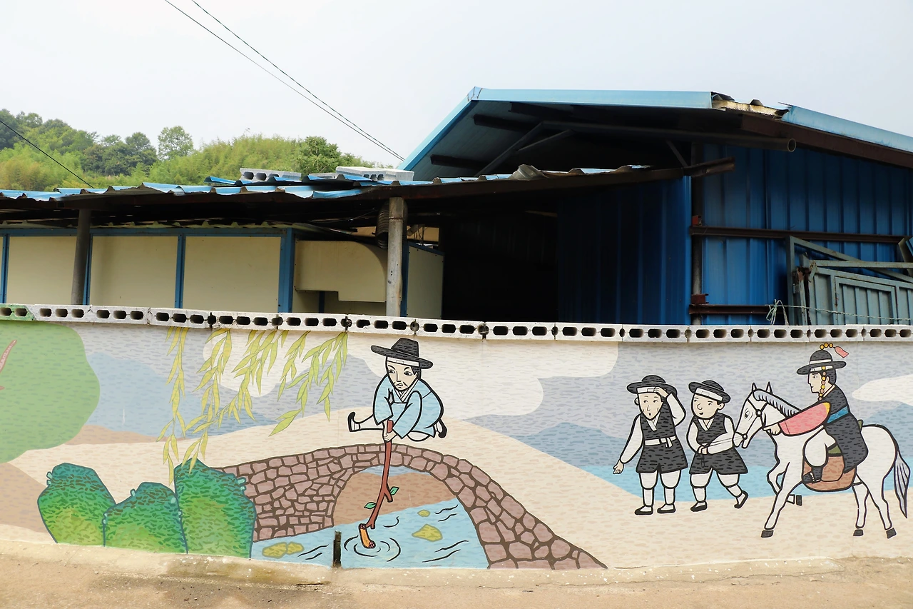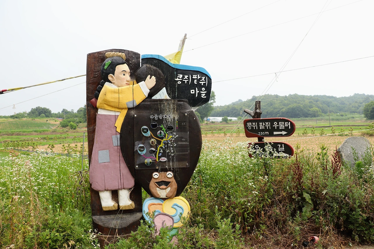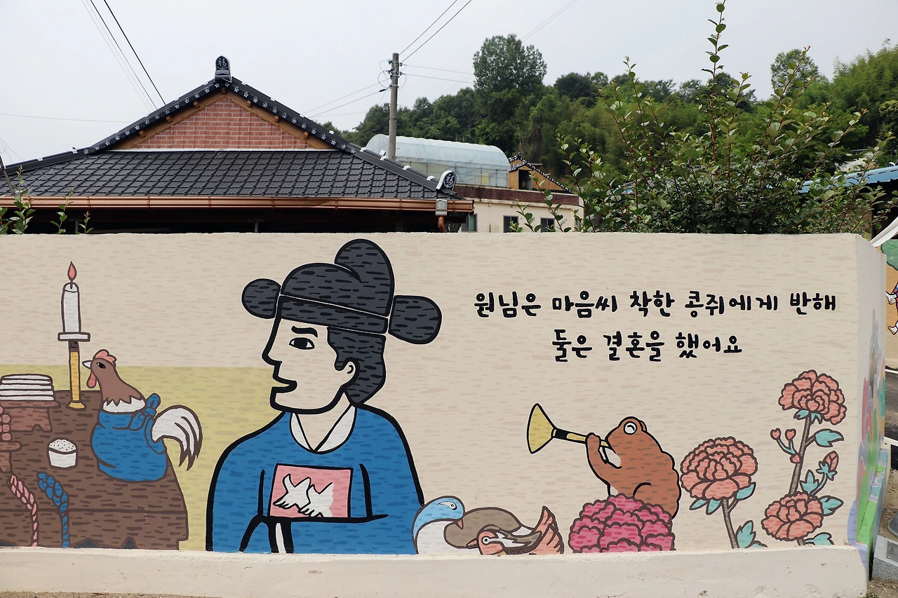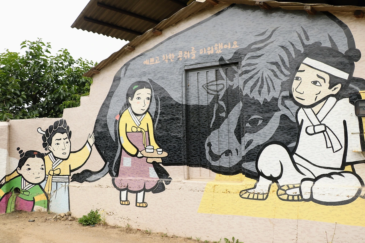 출발하자마자 비가 내리기 시작했지만, 너무나도 오랜만에 만나는 비라 아쉬움보다는 반가움이 컸다. 마을 입구에 들어서니 신기하게도 비가 잠시 그쳐주었다. ‘위치가 콩쥐팥쥐 배경일뿐 평범한 시골마을이겠지’란 생각으로 기대 없이 간 탓인지 생각보다 알차게 그려있는 벽화에 놀랐다. 마을 벽에는 콩쥐팥쥐전의 전체 내용이 입구부터 차례대로 그려져 있었다. 또 중간중간 전혀 다른 화풍으로 그린 콩쥐의 실루엣 그림이나, 꽃 그림도 볼만했다. 팥쥐는 참 못생기게도 그려놨고, 콩쥐는 착해 보였다. 게다가 비가 한 차례 지나간 덕분에 마을에서 자라고 있는 식물들이 더욱 맑은 색을 내고 있었다.