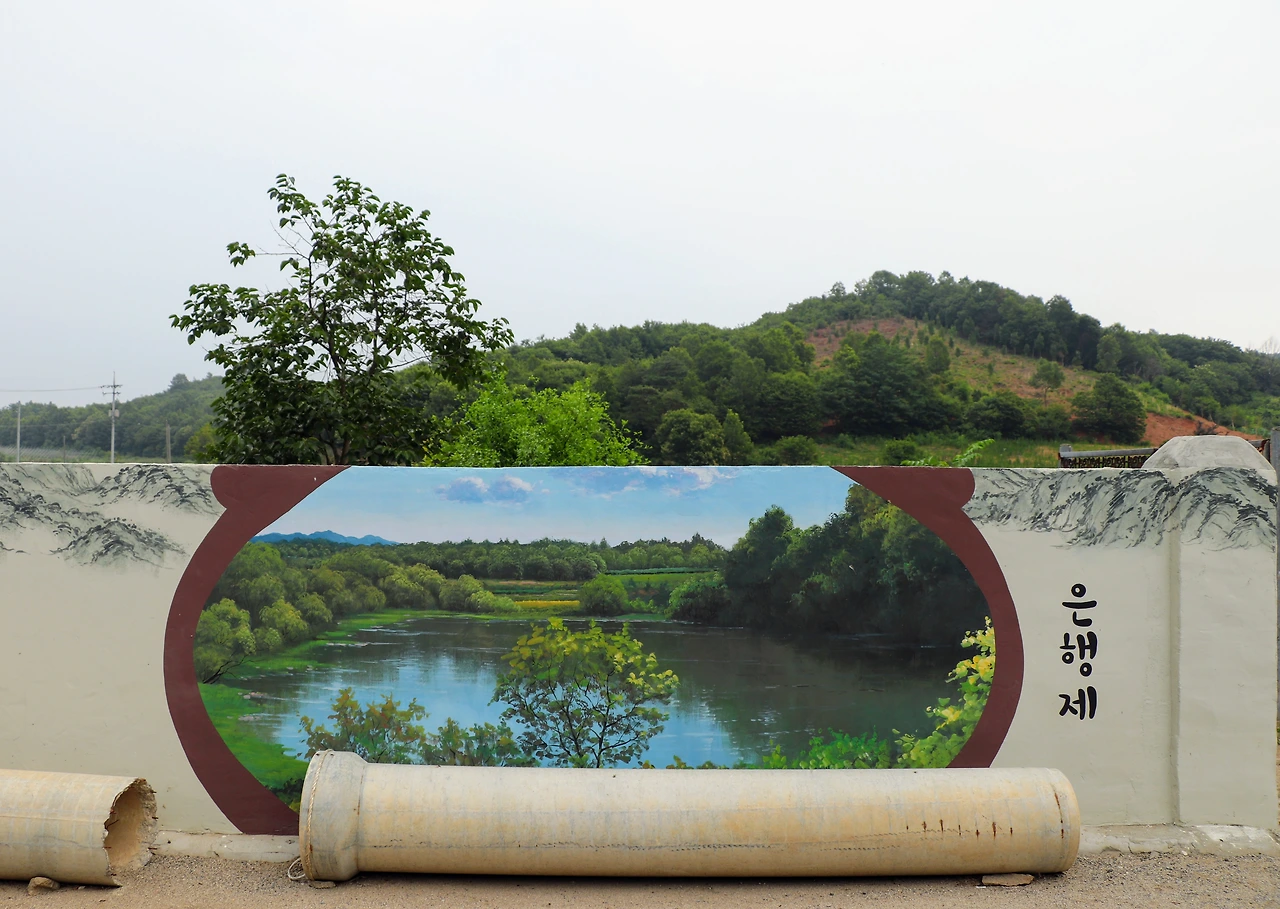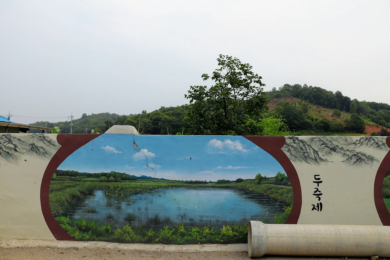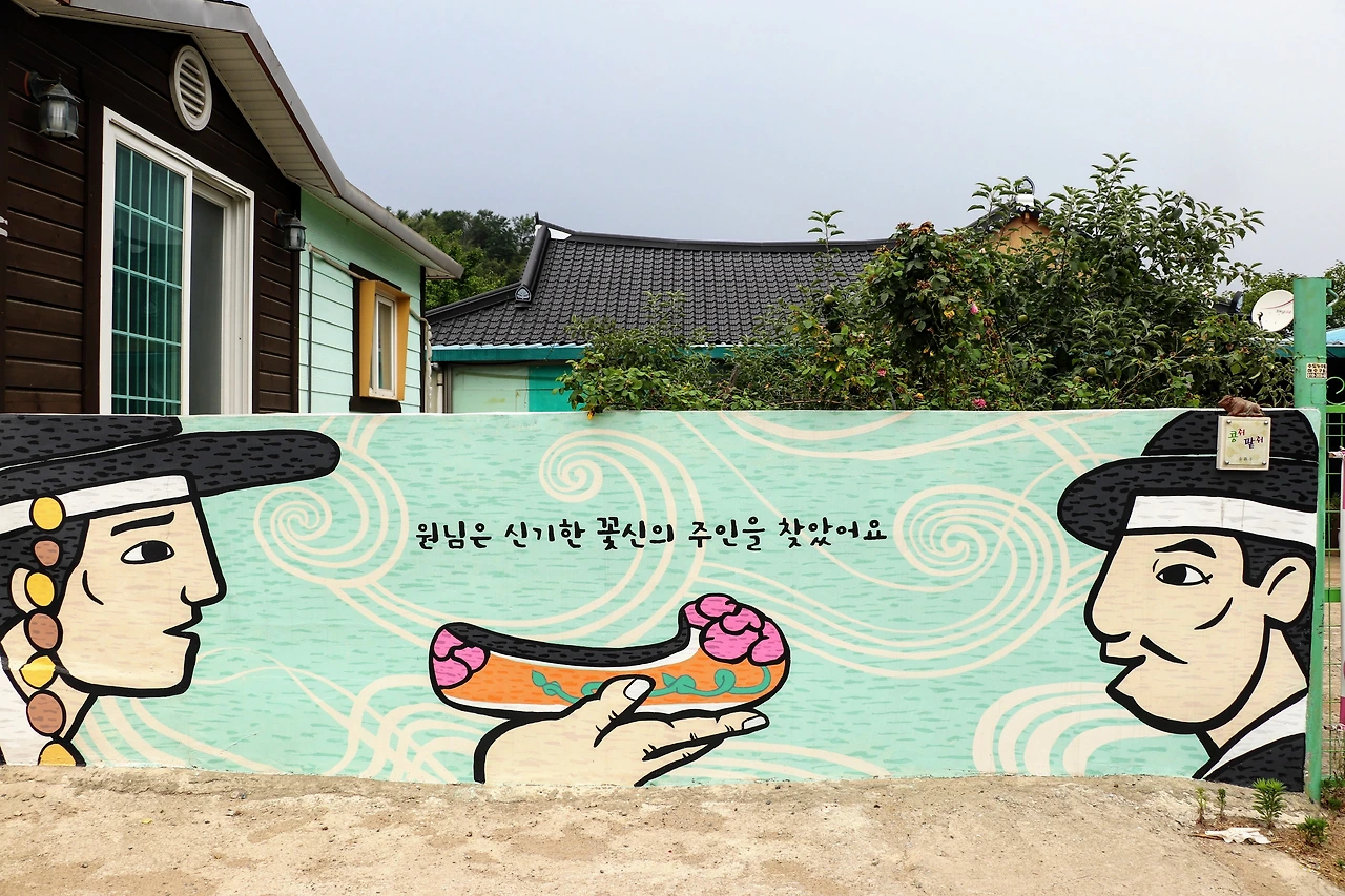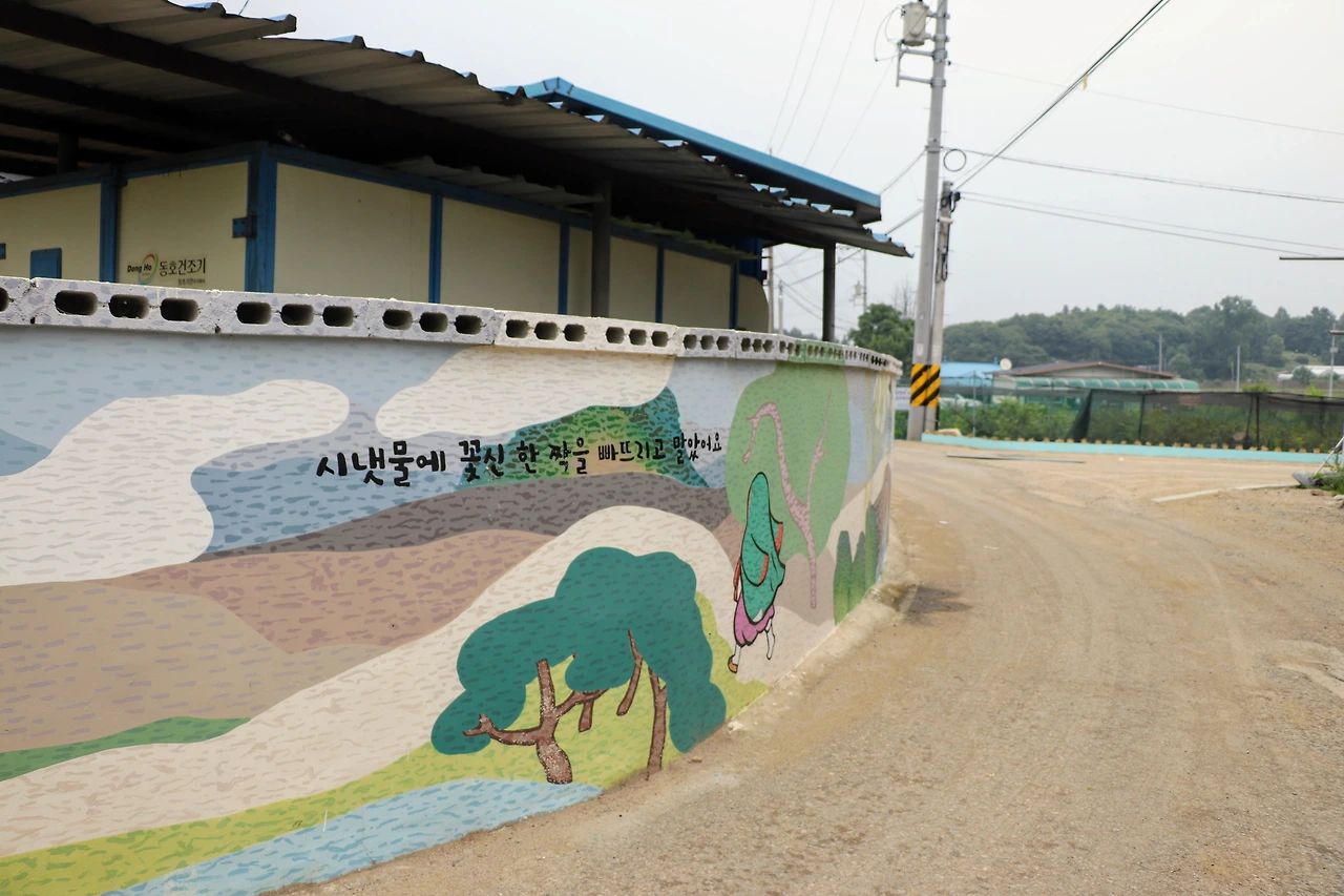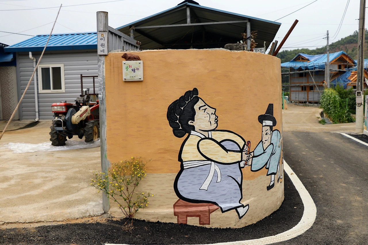 출발하자마자 비가 내리기 시작했지만, 너무나도 오랜만에 만나는 비라 아쉬움보다는 반가움이 컸다. 마을 입구에 들어서니 신기하게도 비가 잠시 그쳐주었다. ‘위치가 콩쥐팥쥐 배경일뿐 평범한 시골마을이겠지’란 생각으로 기대 없이 간 탓인지 생각보다 알차게 그려있는 벽화에 놀랐다. 마을 벽에는 콩쥐팥쥐전의 전체 내용이 입구부터 차례대로 그려져 있었다. 또 중간중간 전혀 다른 화풍으로 그린 콩쥐의 실루엣 그림이나, 꽃 그림도 볼만했다. 팥쥐는 참 못생기게도 그려놨고, 콩쥐는 착해 보였다. 게다가 비가 한 차례 지나간 덕분에 마을에서 자라고 있는 식물들이 더욱 맑은 색을 내고 있었다.