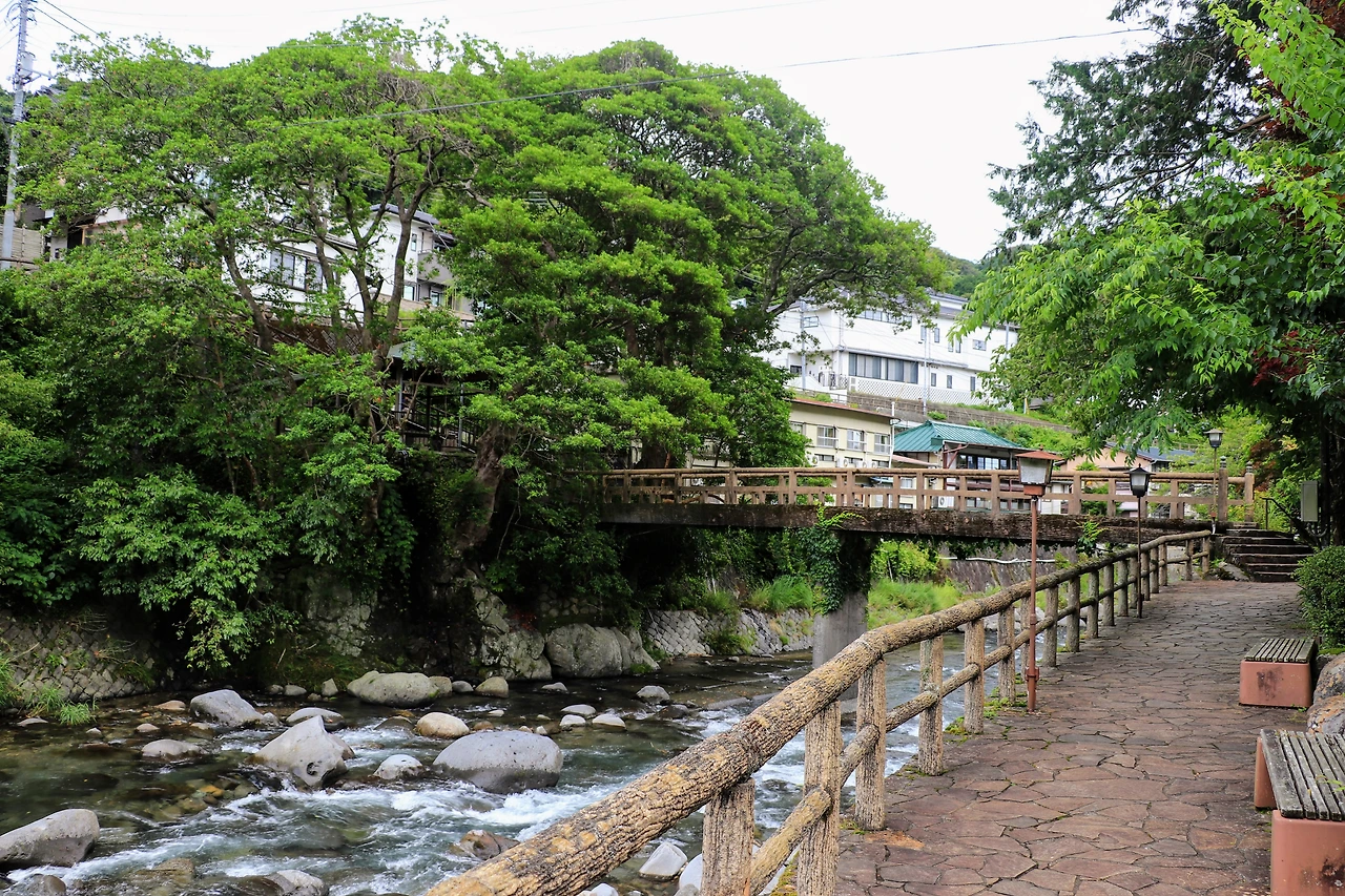 무희 일행을 따라잡으려 빠른 속도로 걷기 시작한 ‘이즈의 무희’의 주인공을 따라, 우리는 차를 타고 열심히 달렸다. 아마기 고개를 곁에 두고 뻗어 있는 도로를 달려 도착한 한 료칸. 시즈오카 유가노 온천 湯ヶ野温泉 에 위치한 이곳은 무희들과 일행이 된 주인공이 머문 숙소, 후쿠다야 福田家 다. 료칸 바로 앞으로 하천이 흘러 물소리가 크게 들리는 운치 있는 공간이었다. 하천 건너에 족욕탕이 하나 있었는데, 이곳에서 재미난 이야기가 피어났다.